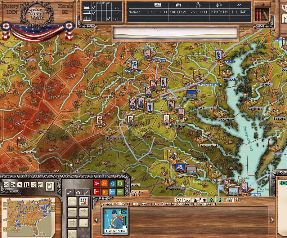 The Army of Potomac, at N.Virginia, continues growing it's forces. In 2 or 3 more turns, the total divisions will be about 20 divisions, and beginning the good time I will attack the rebel lines to Richmond.