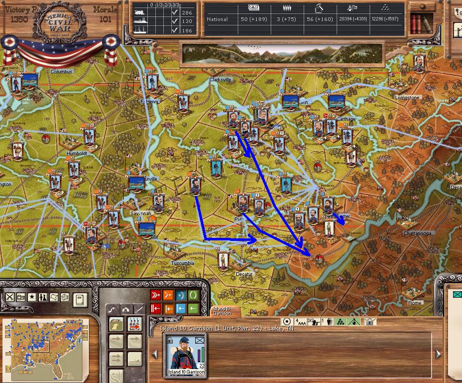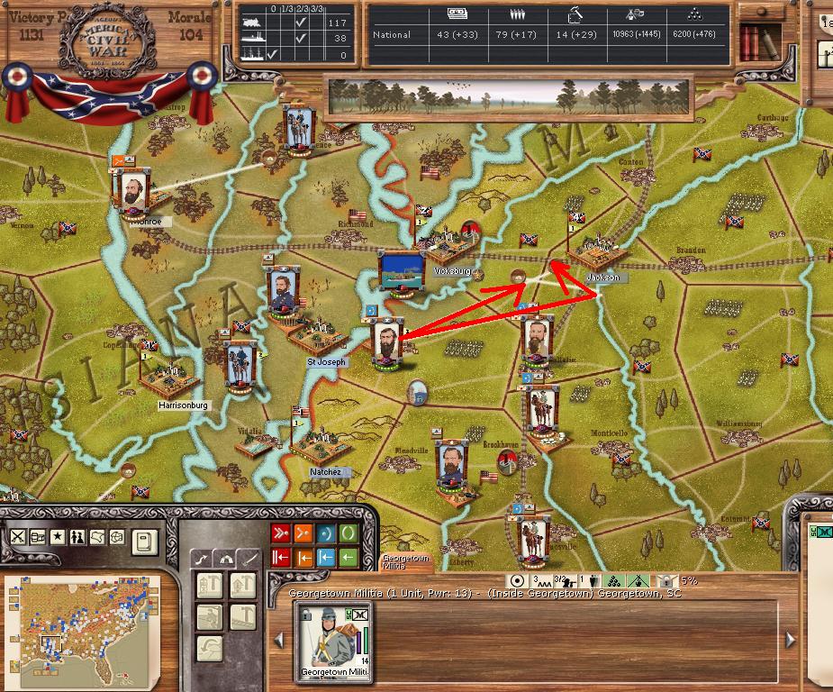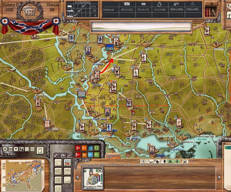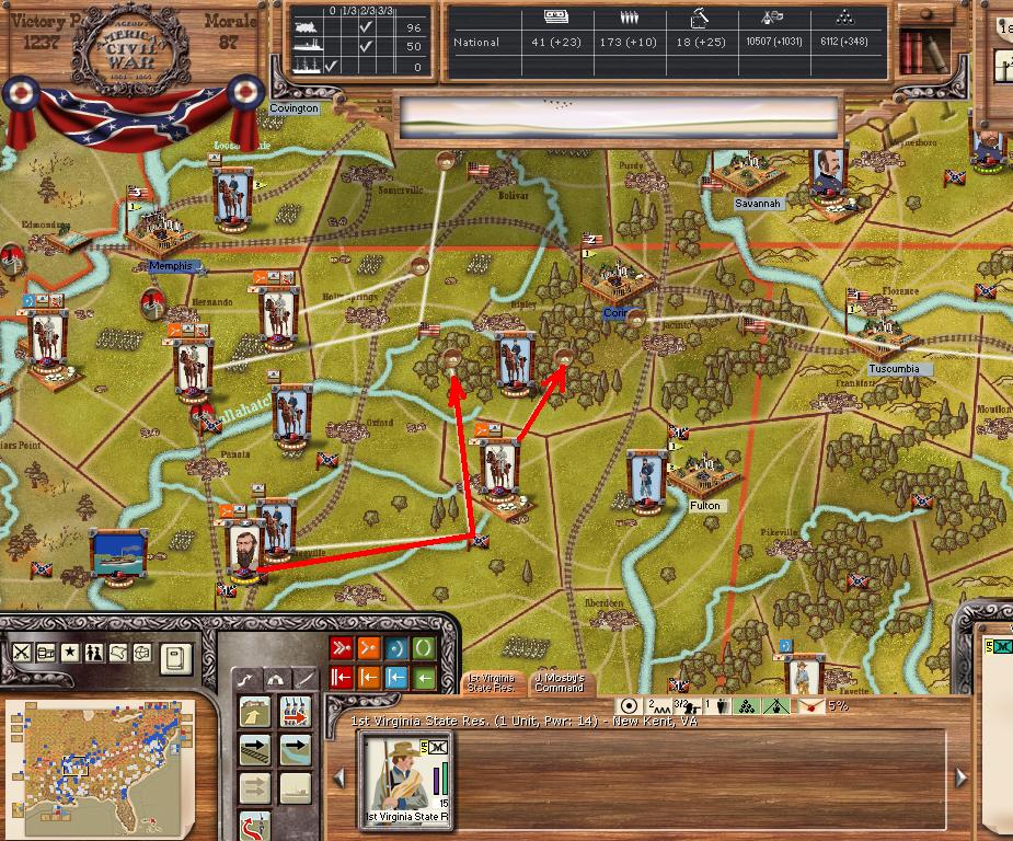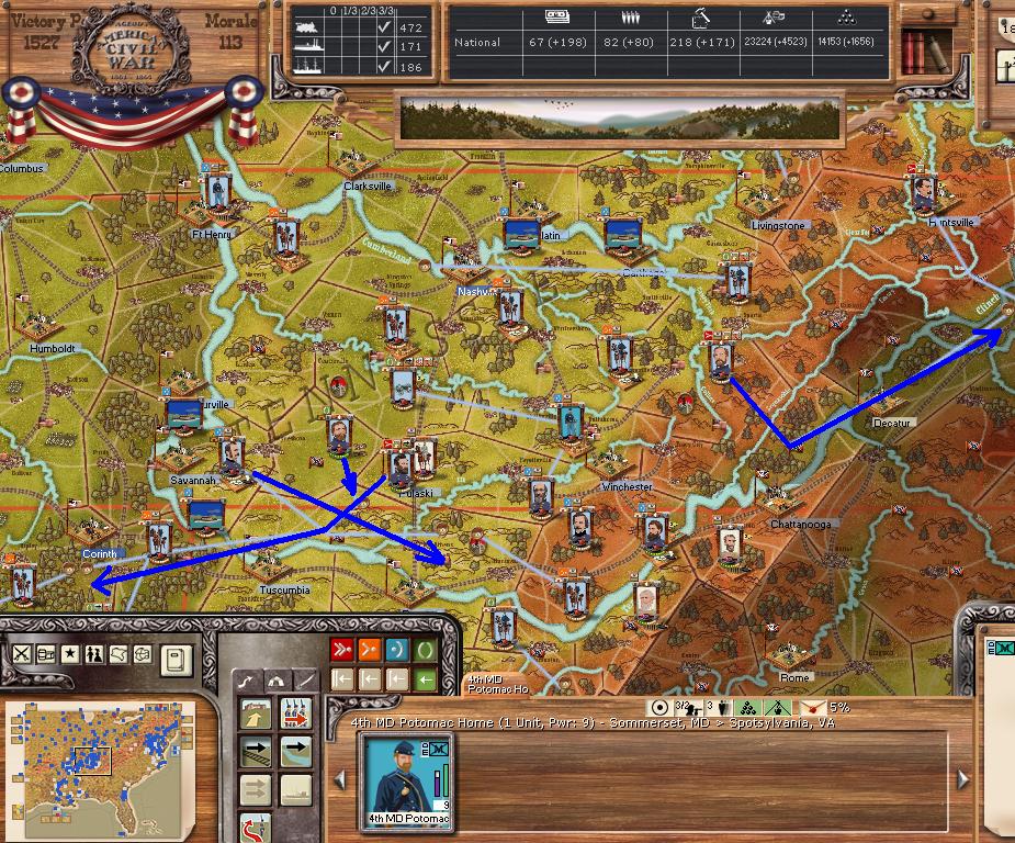 CSA - don't lose badly! I will try to avoid battles and withdraw as necessary while I try to gather a force large enough for a counter strike somewhere. I will harrass rear areas with cav. I will concede the far west and try to move those forces east. I build a few milita and cav, but am being very conserative with my draft and financial choices to try and make up victory points.