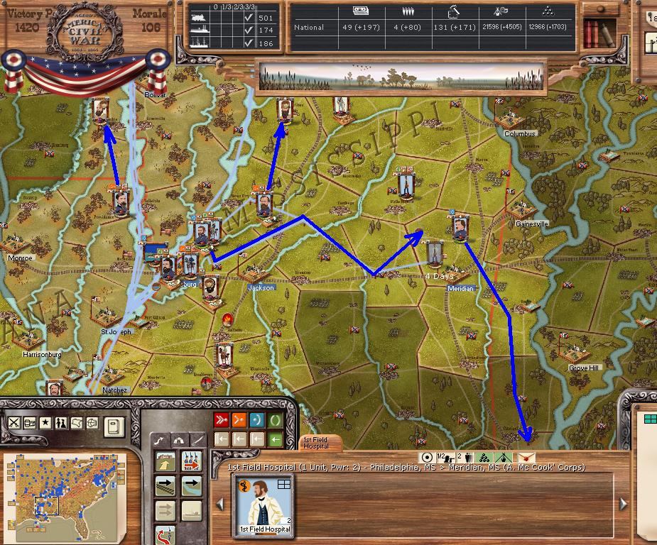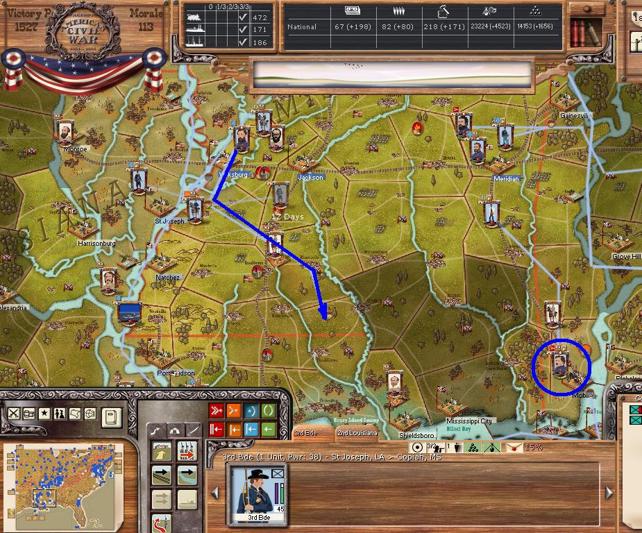 No comments from Manstein. AOP assualts the Lee and Richmond (trying to trap Lee and Jackson). AOT attack eastwards against the AOM, with McCook moving to Mobile. Mississsippi Command continues the reorganization.