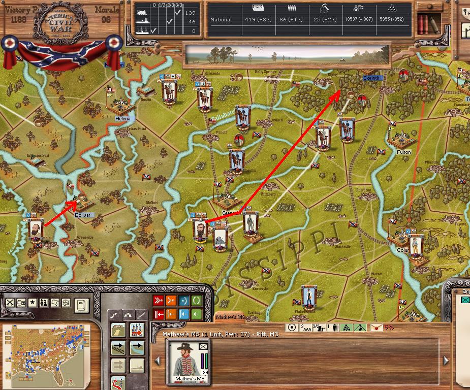 At Nashville, my army under Ord's command his growing his forces too, and I hope to have about 15 divisions in a few turns, then I will attack Chattanooga to Atlanta. The forces around Memphis has formed the right wing Corps of this army, under Cook's command, stationed now at Corinth, defending the pass to Memphis, but it will take the offensive posture when Ord´s army attacks Chattanooga. This Cook´s Corps is really a joker, because ha can support the Ord advance to the south or to be placed under Grant command and support Grant´s army around Vicksburg. He will be used depending on how the rebel forces will be positioned.