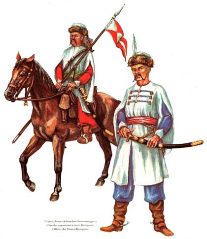 The Uhlanen were maintained by the Polish Republic and hired into Saxon service. They participated in all campaigns from 1757 onwards. Initially with the Austrian armies, later on with the Reichsarmee in Saxony. After the death of king August III, they were returned to Poland. Two Pulks were kept on Warsaw's provisions budget in March 1757. Each Pulk had 6 Hoffahnen (court-banners), 1 banner counting 75 men. They were especially recruited in Lithuania and from Tartars. It seems that their tactical role was to scout and skirmish in support of saxon chevaulegers.