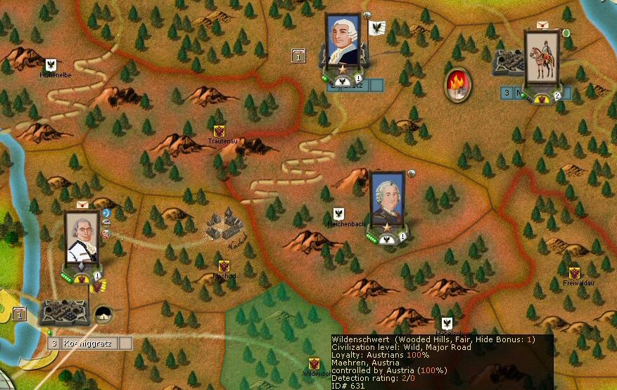 I have seen retreats like this in this area of the map quite a bit, but this one just looks more wrong than the others. Forces shouldn't be retreating into the area from where their attackers have come from. On another occassion I had a force in Neisse, controlled Kosel, was attacked from Glatz, and retreated there instead of to Kosel. :(