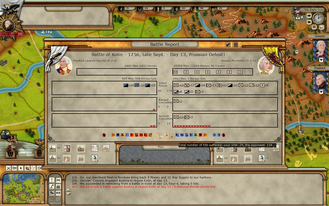 In the Battle, Gessler brigade attacking Picolomini Force in region of Kolin. In the battle report it is saying this but reality is Gessler having battle with only Gaisruck brigade just seperated from Picolomini Force. Gessler targeting only Gaisruck Brigade. After successful battle Gessler able to destroy many line inf elements of Gaisruck. In the Battle report it says Gessler defeated. Reason is piccolomini coloum start to support ongoing battle. (Gessler didnt fight with any Picolomini force). Battle report shows 29 hit taken by Prussians on the other hand 134 by Gaisruck brigade. Result is 5 NM loss for Prussia.. Gessler lost 500 men while Gaisruck lost 2461..