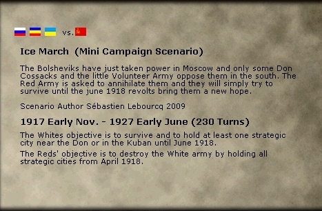 Coming back to the November 1917 campaign, I've started to like the concept: if you play as the Whites and win it ( = resist), you have earned the right to play the big campaigns because the Bolsheviks couldn't stop all resistance. If you fail, then there is no Civil War. I don't know if it makes sense :confused: