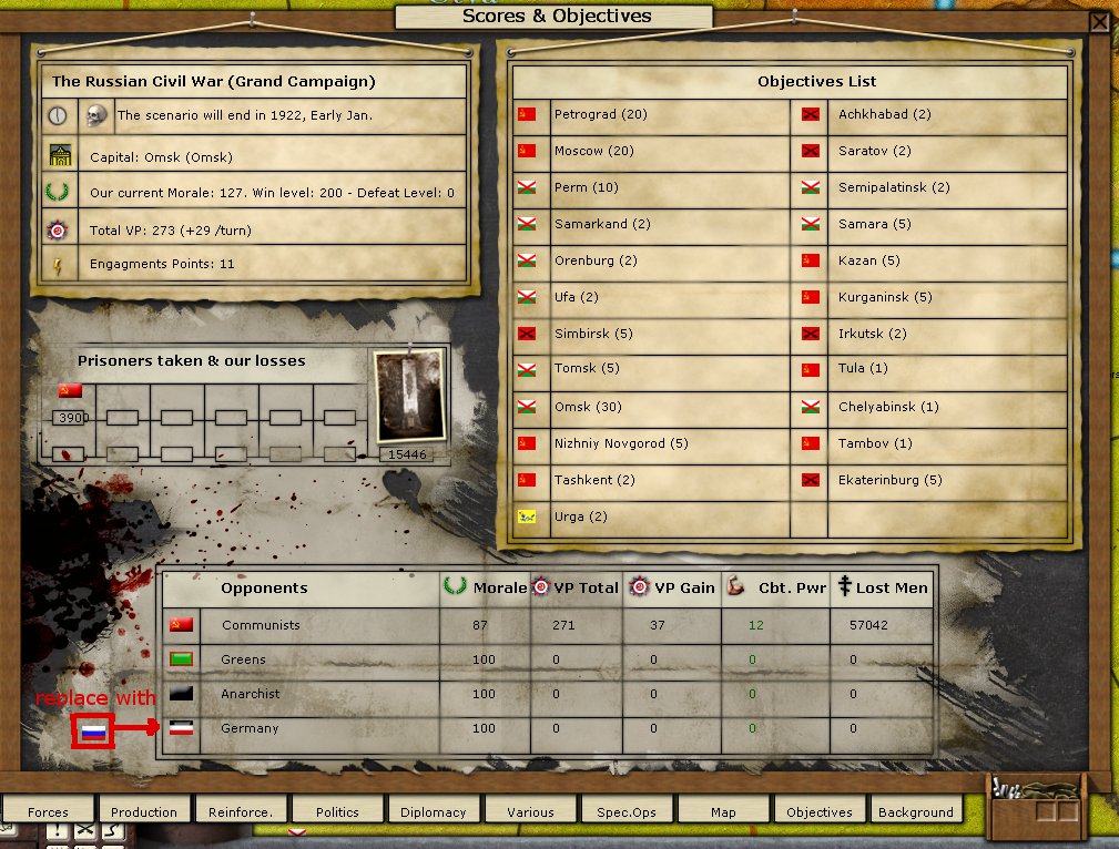 1) One thing that always seems strange is how little the White players knows about his allied faction in the Grand Campaign. One would think that Southern and Siberian Whites would have knowledge of each others operations. Here is one little thing to improve this: Remove the Germans from the faction list in the Obejctives ledger and add the other White faction instead. The Germans are irrelevant to this campaign, the other White faction isn't.