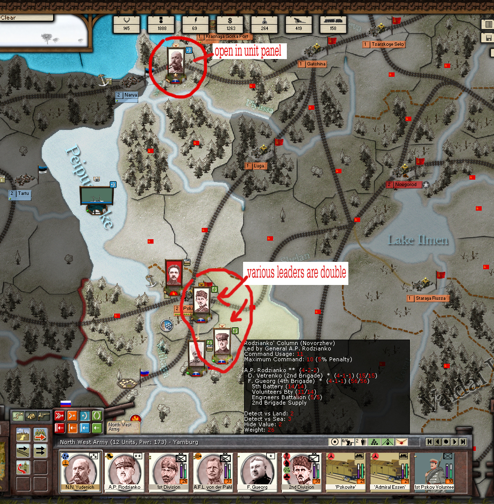 Bug: Yudenich arrived with duplicate generals already existing in Norvorzhev south of Pskov along with duplicate armor trains.