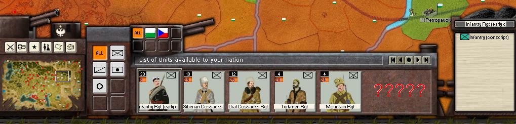 On another note: is it on purpose that the Southern White doesn't have any cities where he can build artillery or armored trains? :confused: Most infantries can be built in any city, but I cannot find a single city on the map shown in green for the construction of artillery (even after conquering the strategic cities south of Azov). Neither is it possible to build Northern White artillery or peasants in Murmansk or Archangelsk. That really doesn't make sense: One can build infantry regiments, but not peasant militia? It is possible to build a gunboat but not artillery (I always thought those things got their name because of the guns they carried)? :confused:
