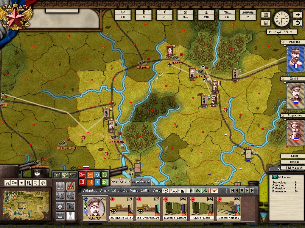 Je suis actuellement à la fin septembre 1919. Les opérations militaires ont véritablement commencé au printemps de cette même année. L'hiver rude de Russie empêche les opérations militaires d'envergure et j'ai préféré profiter de la trêve hivernale pour réorganiser mes armées et préparer mes prochaines offensives [depuis que j'ai perdu la moitié d'un corps en un tour à cause de l'hiver dans une autre partie, je n'ose plus bouger dès qu'il fait froid] . Des campagnes de réquisition et de conscription alimentent mes réserves. Les Blancs du Sud ont à leur disposition deux armées : l'Armée des Volontaires de Denikine et l'armée des Cosaques du Don. Je concentre les forces de Denikine (un corps d'infanterie, un corps de cavalerie commandé par Wrangel puis les trains blindés sous le commandement direct de Denikine) dans le Kouban pour combattre l'armée rouge qui s'y trouve et sécuriser mon flanc sud. Les Cosaques (trois corps d'armée) se dirigent vers Tsaritsyn et installent leurs camps d'hiver sur les bords du Don.