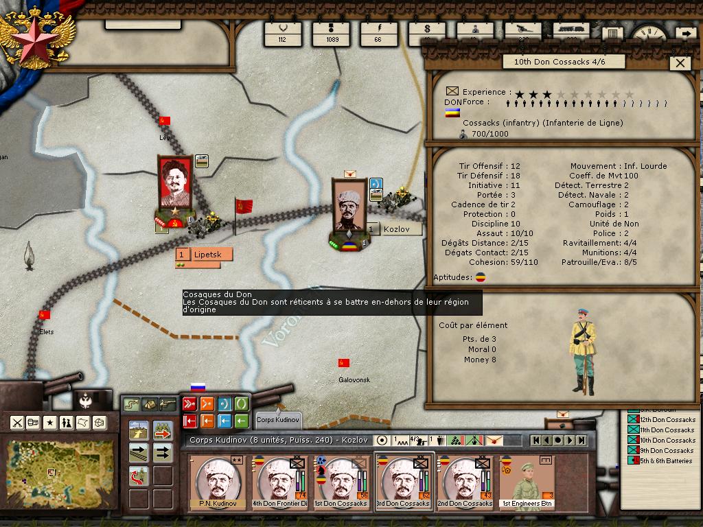 A Tsaristyn, 50 000 cosaques piègent Staline, commandant des armées rouges sur le Front Sud, dans la ville [facile avec l'IA au minimum]. Celle-ci tombent après quelques semaines de siège. La chute de Tsaristyn ouvrent la route vers le route et les Cosaques du Don remontent la voie ferrée vers Tambov. En septembre 1919, Trotski est signalé avec des renforts dans la région. Le futur rival de Staline est un général redoutable grâce à ses nombreuses caractéristiques uniques [train blindé personnel qui donne d'importants bonus aux troupes]. Cependant, les reconnaissances indiquent que ses troupes sont démoralisées. Kudinov, commandant l'un des corps cosaques, décident d'attaquer sans attendre les renforts. L'armée ennemie est repoussée et Tambov est assiégé. Plus à l'ouest, Denikine et Wrangel, qui remontent vers le nord parallèlement aux Cosaques du Don, mettent le siège devant Voronezh. Si les deux verrous sautent, les deux armées pourront faire leur jonction à Lipetsk et envisager une grande offensive vers le nord. J'aimerais prendre Liptesk avant l'hiver. Les quelques mois sans combats offerts par l'hiver russe me permettront de renforcer Denikine et les Cosaques, voire de faire remonter l'Armée du Caucase dans la région.