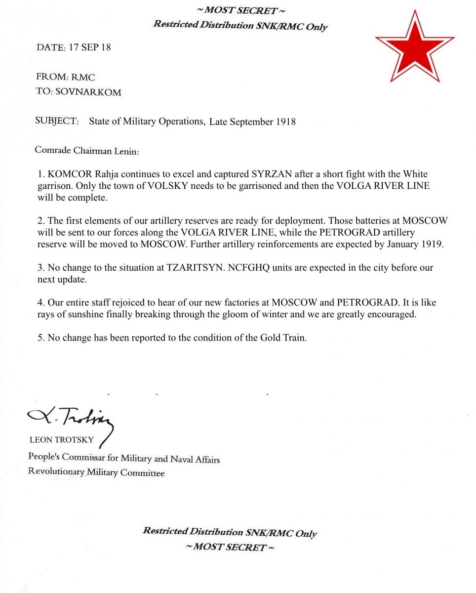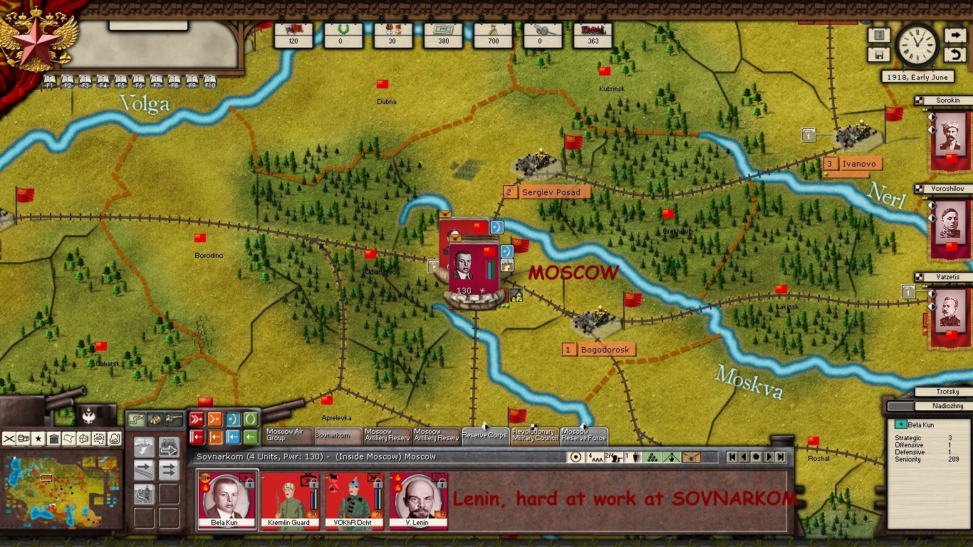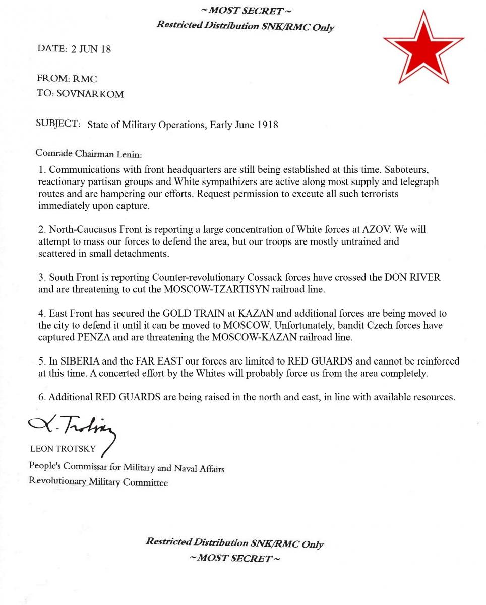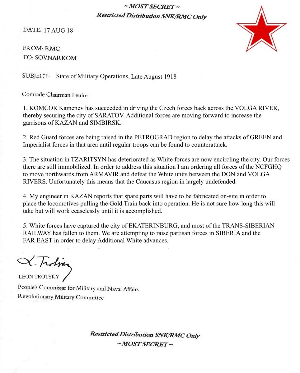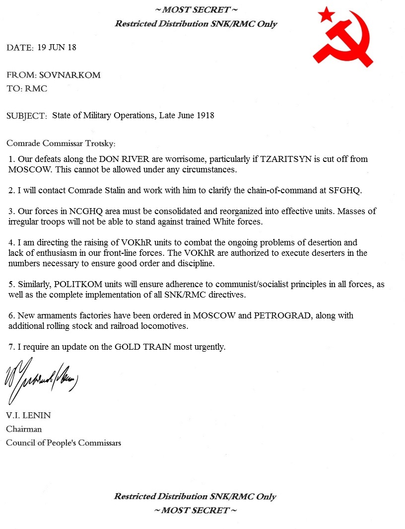Beset by enemies on every side (and, quite frankly, surprised to actually be in charge of a major country after decades of discussion, debate and theorizing...) the Bolsheviks are overwhelmed and unable to develop a coherent strategy as the country slides into chaos and war in the spring of 1918. The two major executive bodies of the revolution - The Council of People's Commissars (Russian abbreviation SOVNARKOM, or SNK) chaired by V.I. Lenin, and the Revolutionary Military Committee (RMC) chaired by Leon Trotsky create a Joint Planning Commission to review the situation and come up with some guidance for the upcoming struggle. After weeks of deliberation and study the committee provides the following recommendations: