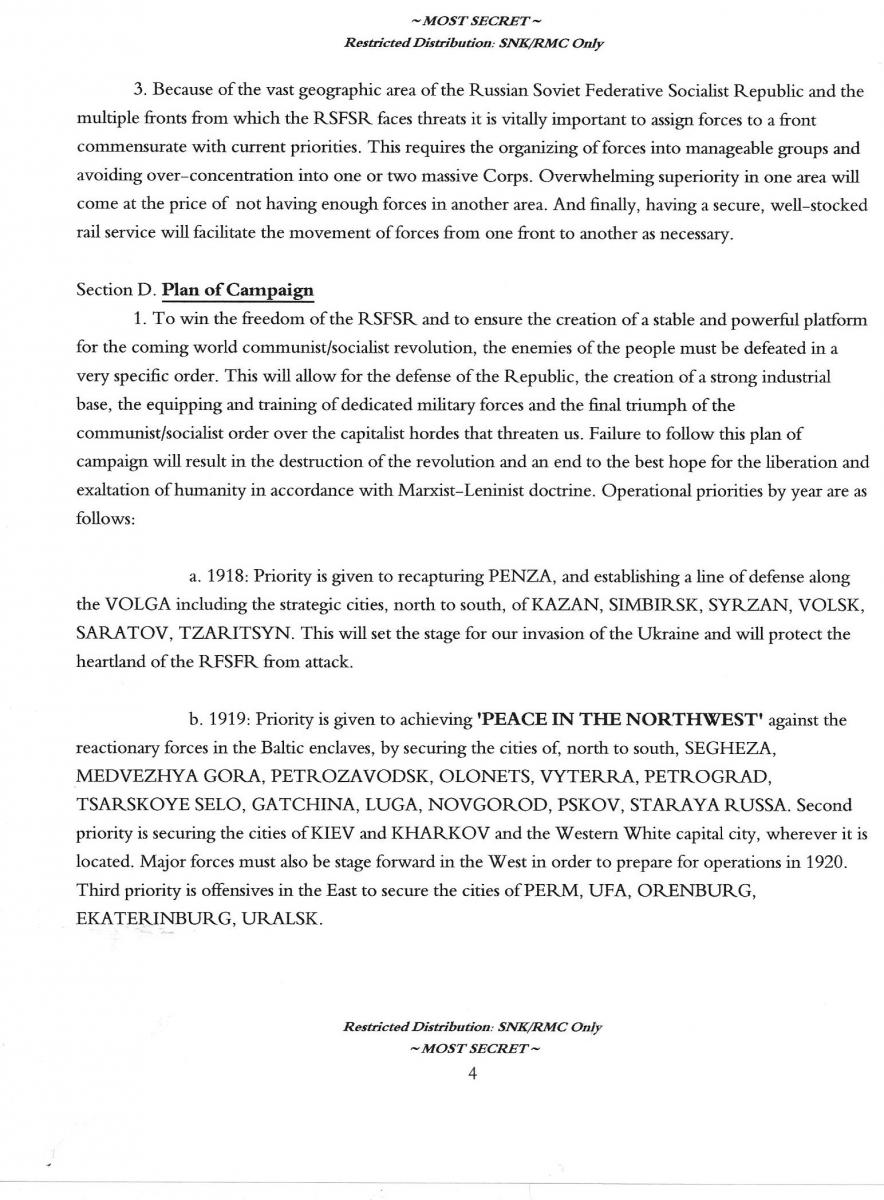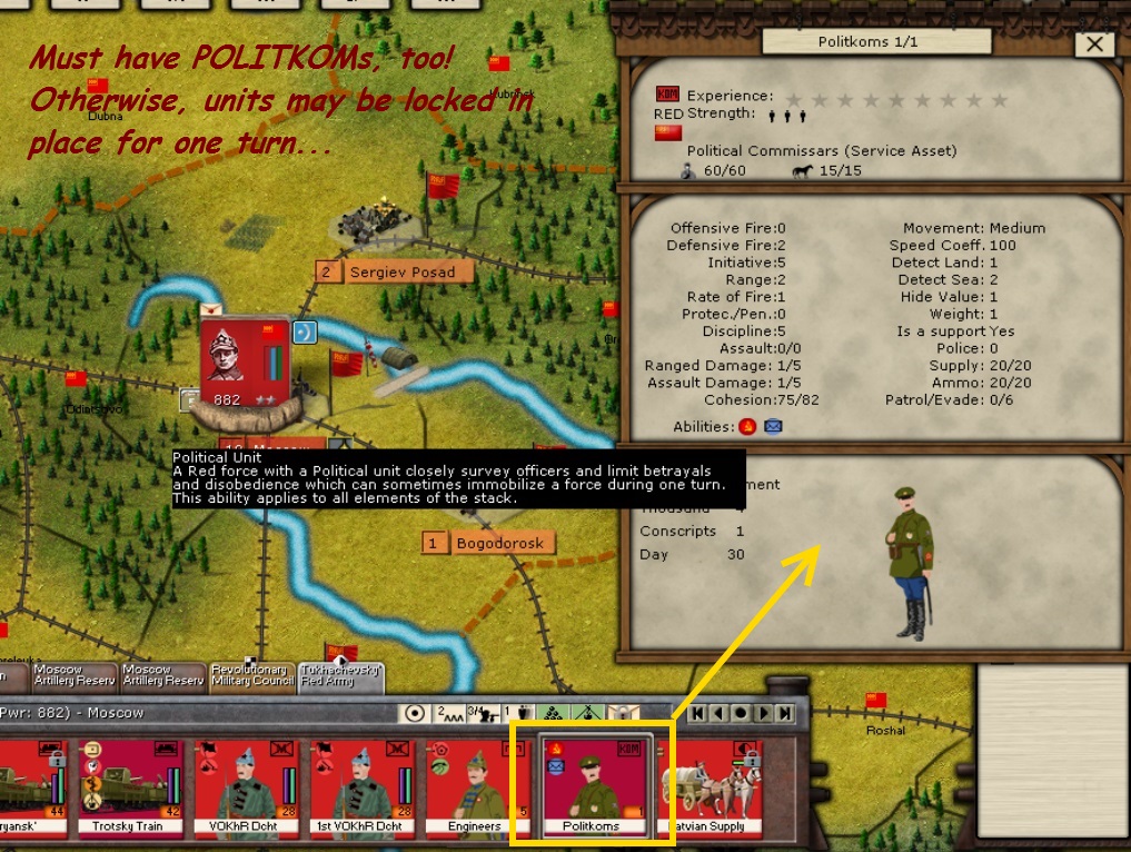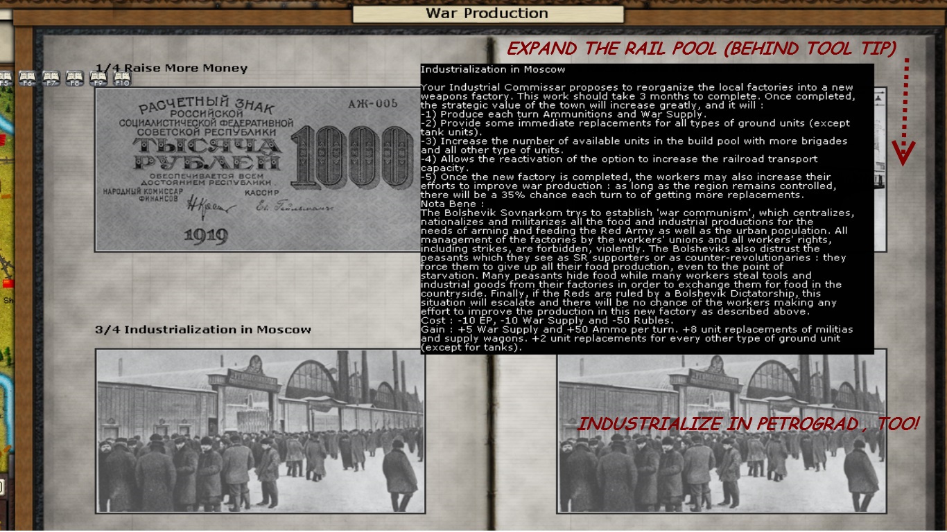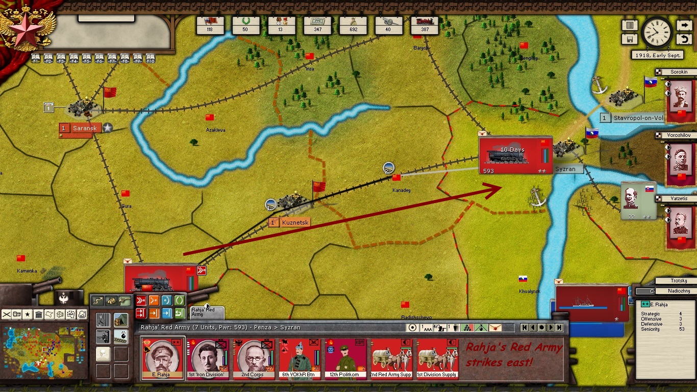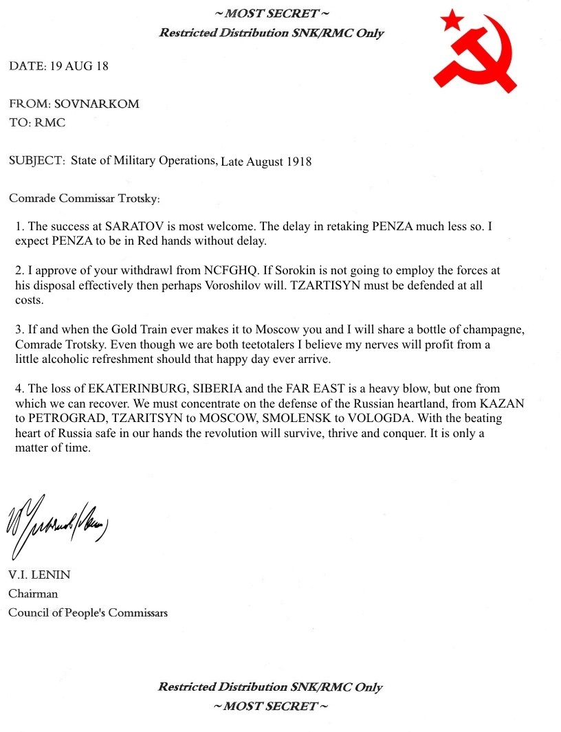 Beset by enemies on every side (and, quite frankly, surprised to actually be in charge of a major country after decades of discussion, debate and theorizing...) the Bolsheviks are overwhelmed and unable to develop a coherent strategy as the country slides into chaos and war in the spring of 1918. The two major executive bodies of the revolution - The Council of People's Commissars (Russian abbreviation SOVNARKOM, or SNK) chaired by V.I. Lenin, and the Revolutionary Military Committee (RMC) chaired by Leon Trotsky create a Joint Planning Commission to review the situation and come up with some guidance for the upcoming struggle. After weeks of deliberation and study the committee provides the following recommendations: