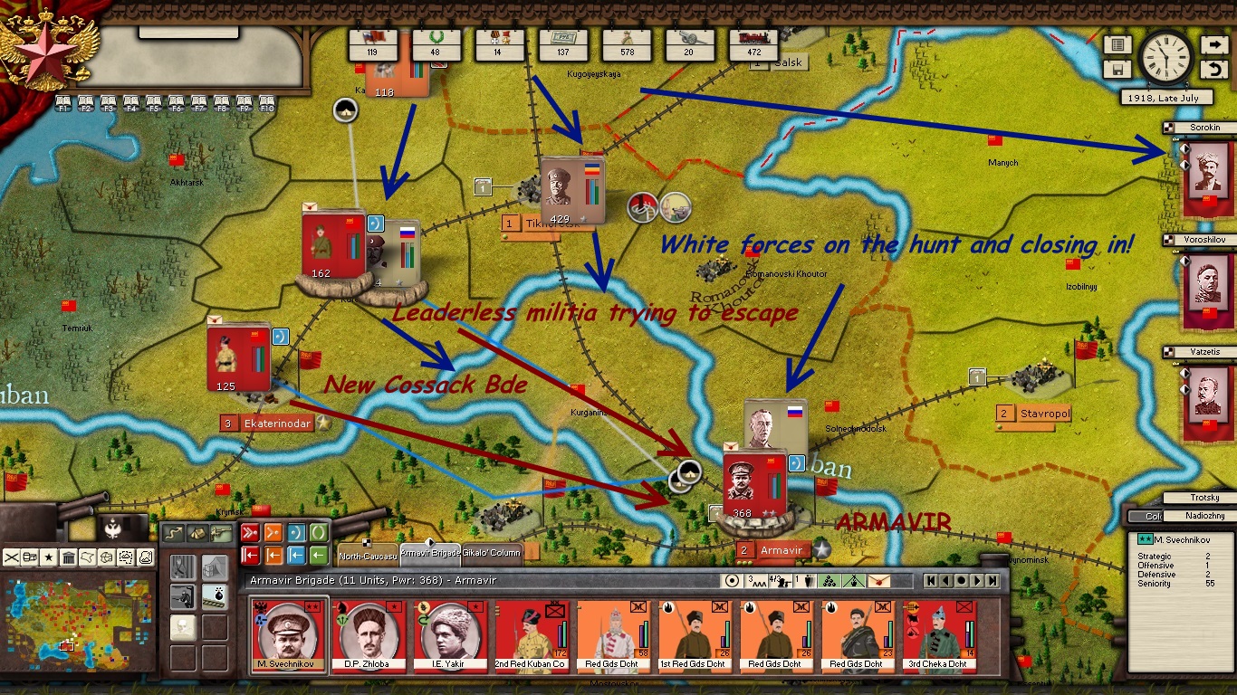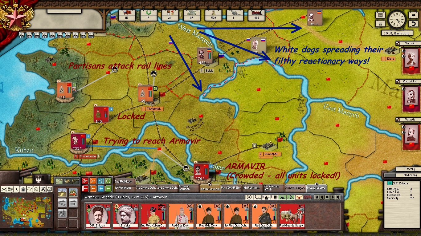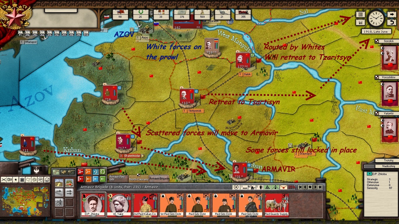 Facing these threats, the Reds have large but disorganized forces at Tzartisyn, near Armavir in the Caucasus, and smaller forces are located in the East, at Moscow and Petrograd.