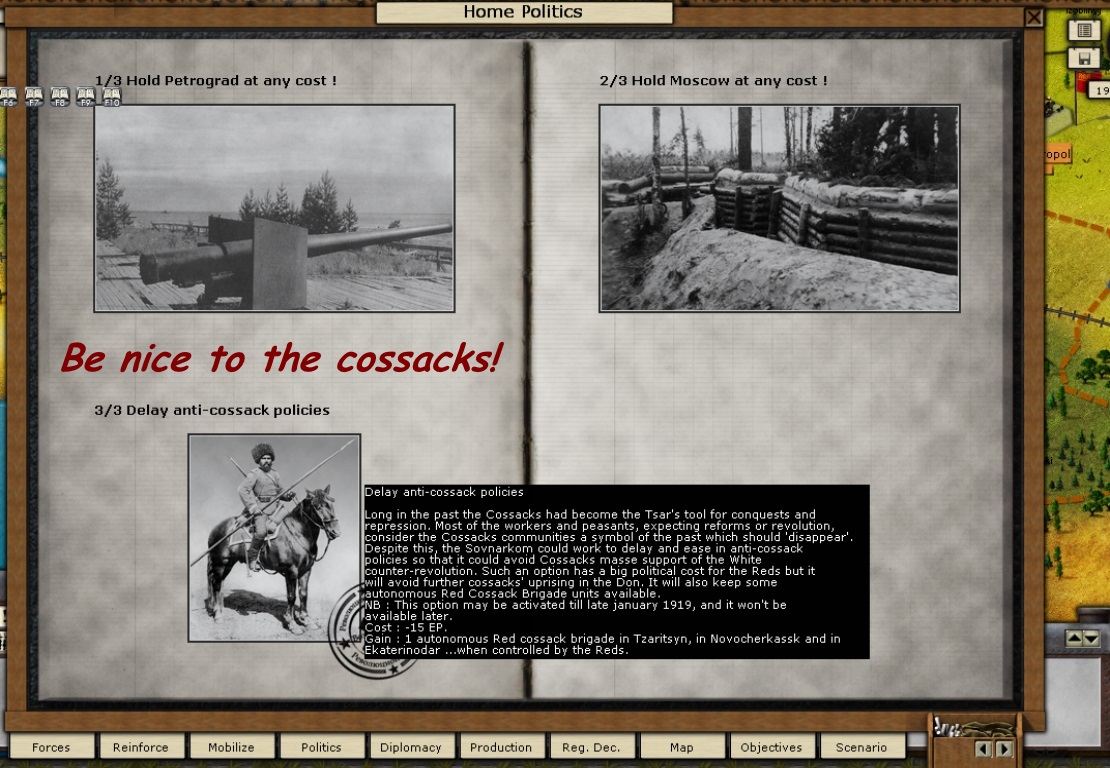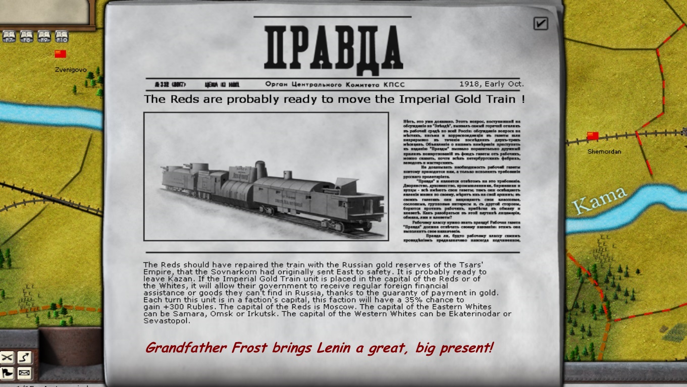 My overall plan is to have a dialogue between Lenin (SOVNARKOM) and Trotsky (RMK) as a framework, followed by screenshot maps and battle results as needed. I anticipate that this will be roughtly four times the work of my last AAR http://www.ageod-forum.com/viewtopic.php?f=387&t=43780 so the pace will be a lot slower. But as before, once I start I intend to fight to the bitter end - on to the victory screen!