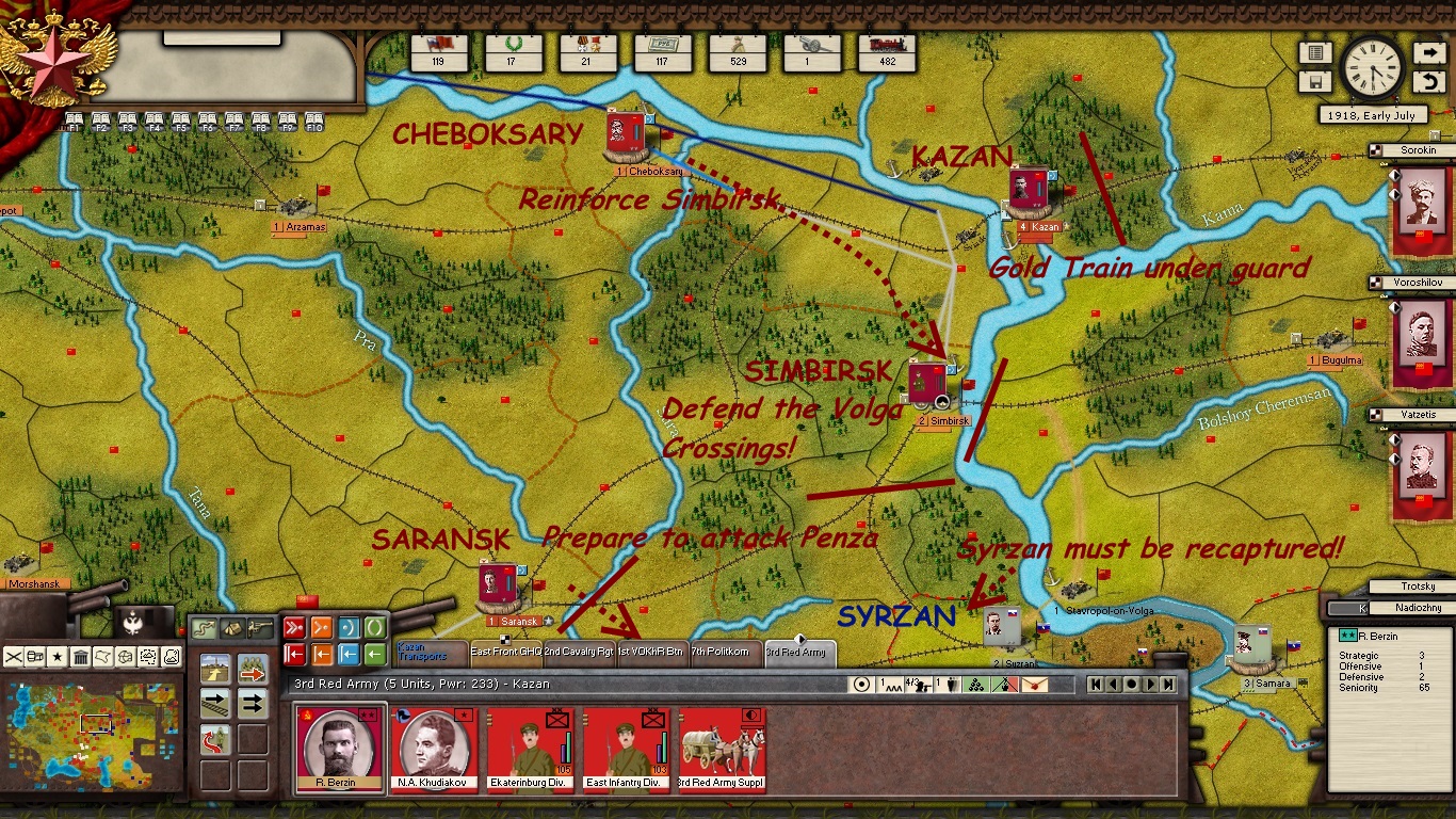 First priorities will be to defend Moscow and Petrograd, form a defensive line along the Volga, and stablize the southern front at Tzaritsyn. How it will all work out remains to be seen...