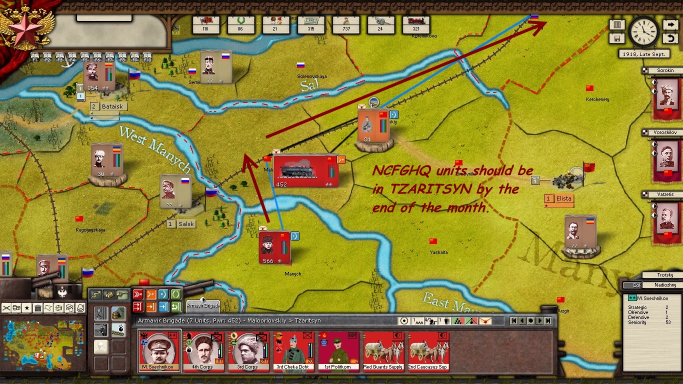 Forces should reach Tzartisyn this week. Let the Whites have the Caucasus. Avenging Red Armies will soon return with fire and sword!