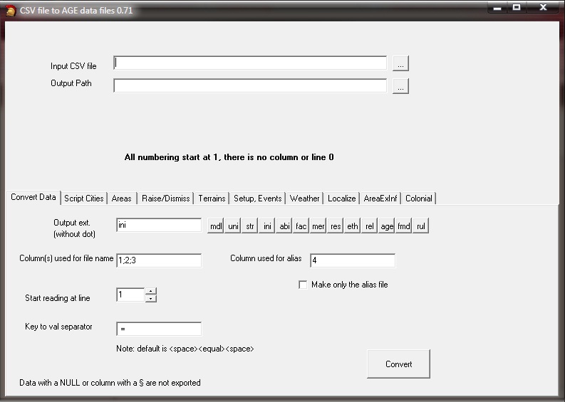 Open the CSV Splitter tool and select the Cities thumbnail in it. Then load the CSV file you have made from the geographical sheet of the Excel scenario file [CitiesXX.csv] and click on OK to export it. It will create in the destination folder (which you can change) a file called “Citiesxxx.inc”. Be certain that this file has the same name as the one listed in the first sheet of the Excel file for the City include. Example: in the 1756 Saxony Scenario, the include file is “CitiesSaxony.inc” in the first sheet, so that’s the name we must use.