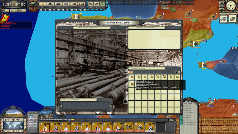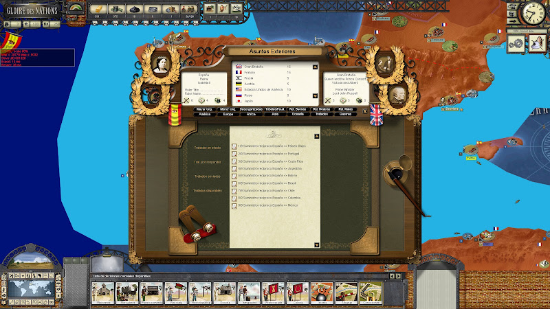 La partida esta muy interesante estoy topando con Francia tanto en el norte de África como en indochina, nuestras relaciones diplomáticas están por los suelos, un desembarco en tunez con marines intentando quitar el control militar tiene la mayor culpa no se por que se lo tomaron a mal :innocent: no me salí con la mía, con lo cual estoy esperando que intente declarar el protectorado sobre Túnez para jugar la carta colonial interés. Ya te explicare si funciona y me salta una crisis diplomática por el control, por si la moscas estoy ampliando mi ejercito colonial y continental ante una mas que probable guerra Hispano-Francesa.