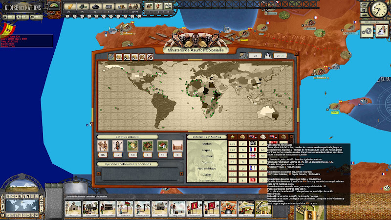 A nivel colonial como esta ahora seria muy fácil ir a por África a lo bestia y podría ser demasiado fácil por que daría un porrón de puntos. Yo bajaría la cantidad de puntos que dan las zonas alejadas de una zona colonia que históricamente no fuera española. Y aumentaría en la zona de las indias orientales (cerca de filipinas) y indochina que comentaba Laruku. De momento solo he tocado el tema colonial para marcar territorio en indochina Marruecos y Argelia aunque aquí los franceses me ganan la partida por control militar.
