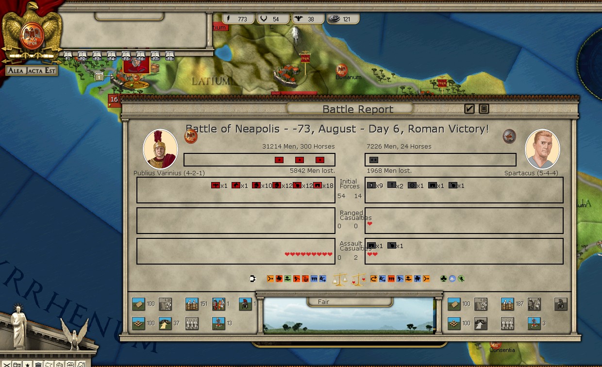Concerning Spartacus, although Crassus eventually corned him in Naples, I didn't take the slave rebellion serious enough early enough, so they still had control of about five or six cities by the end of the game. Of course as happened historically, the demands of the wars against Sertorius and Mithridates left few troops available to fight Spartacus until Crassus showed up.