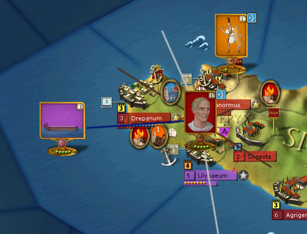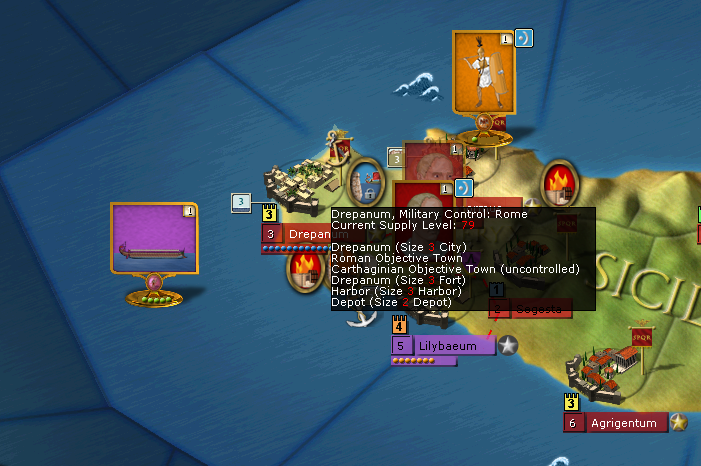 A short time later, a Carthaginian army lands at Drepanum and begins a siege against the Roman city in that region. The image below shows the position of the Carthaginian and Roman armies and the supply status of Drepanum from the Carthaginian point of view.