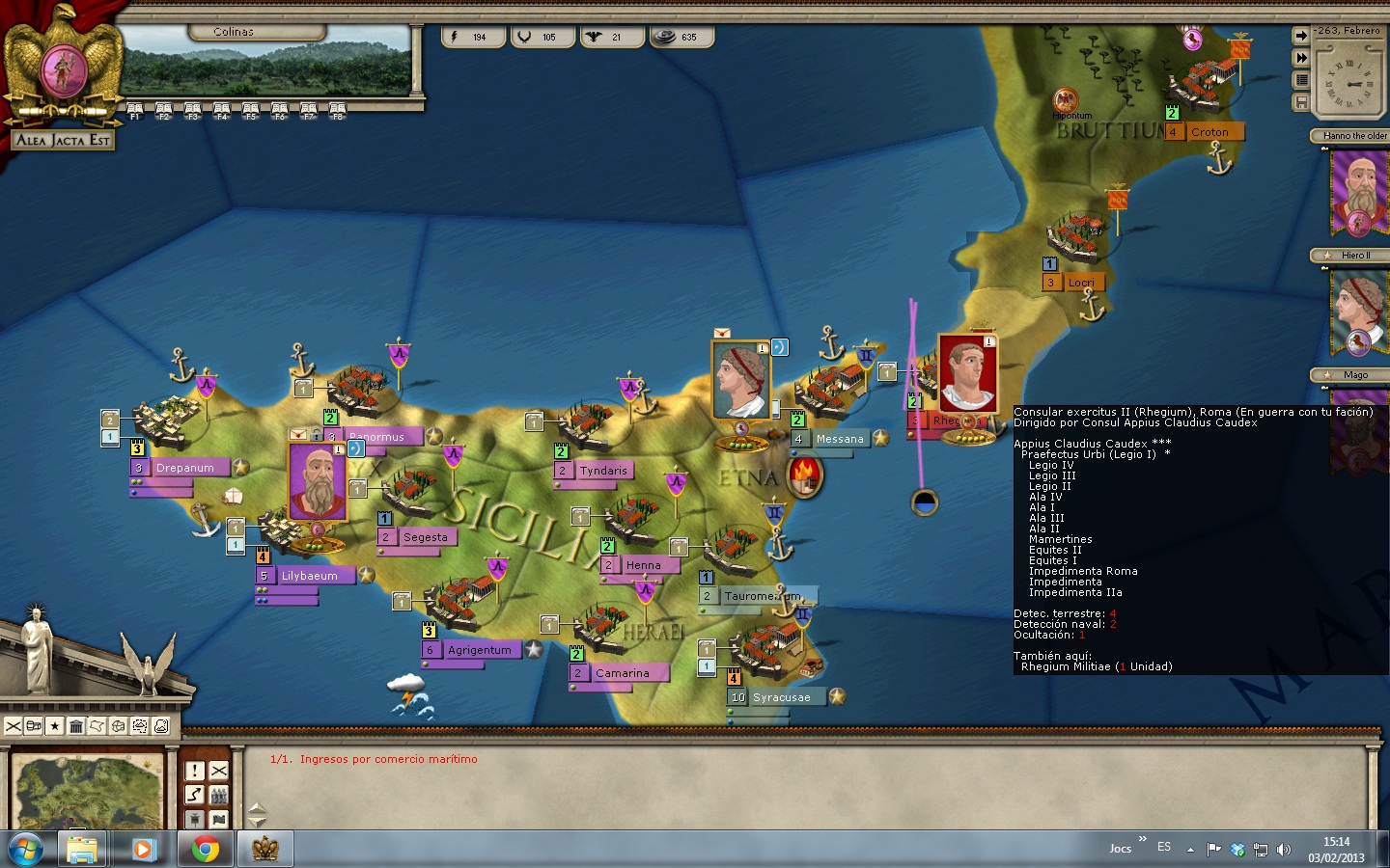 estaba anclado en messana con mi ejercito consular y los tropas de messina y envie desde roma dos legiones una romana y otra alae para reforzar messina y una me tardaba en llegar 24 dias y otra 27 dias y dije bien en un turno estan alli,con dos carros de suministro todo por separado que tarda menos en llegar y dejo el otro ejercito consular con dos legiones asediando la ciudad rebelde.