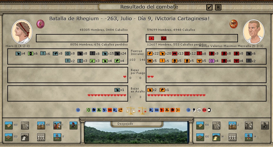 el parte de bajas ahora es al contrario,es que no se postear imagenes pero el punico tuvo varias batallas donde perdio hasta mas de 12000 hombres,ahora mismo cartago lleva en el computo total de bajas 30000 hombres mas en perdidas.