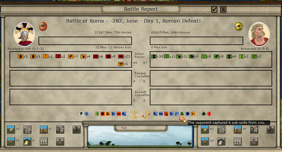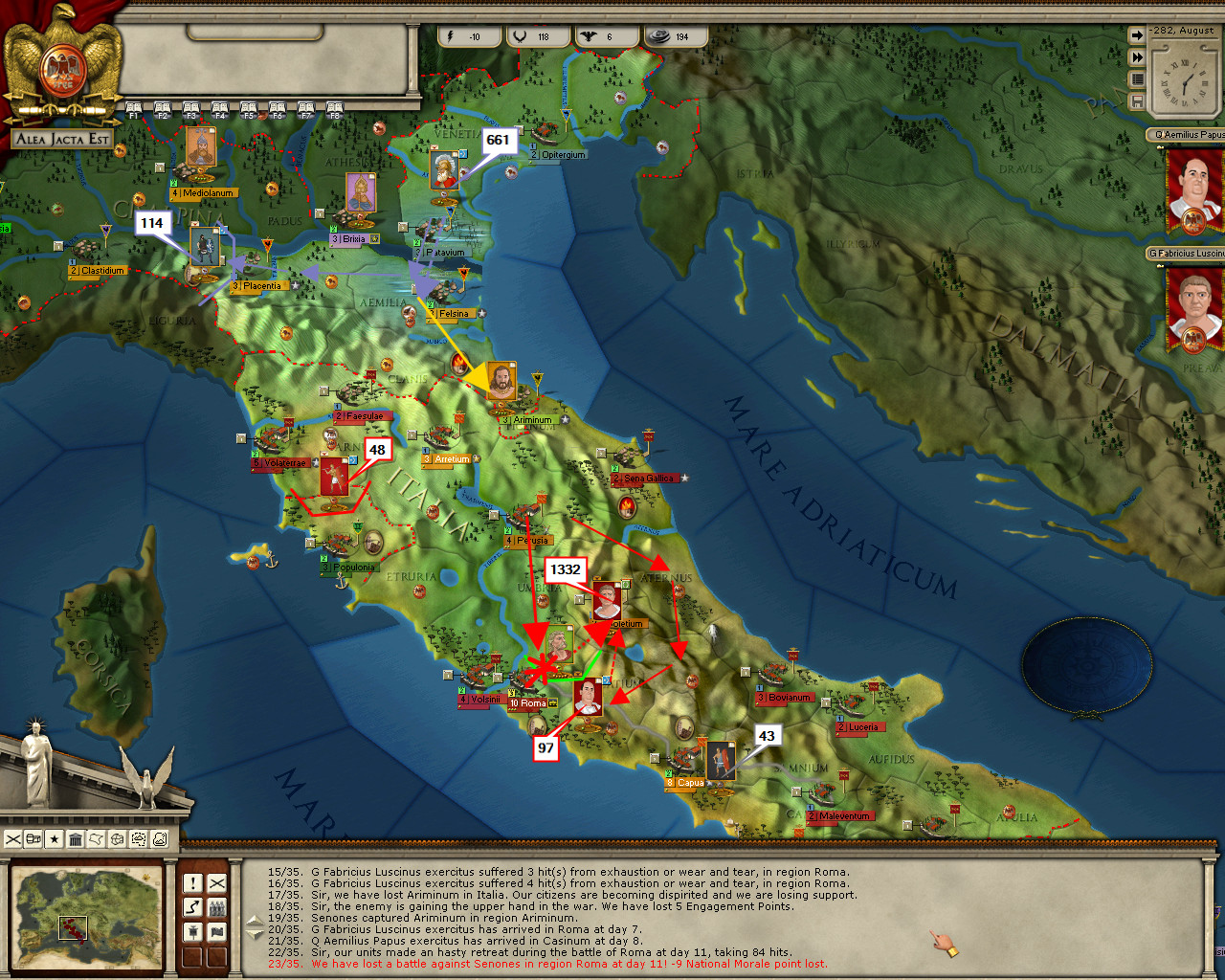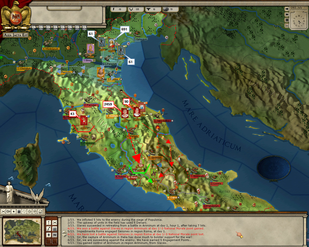 We scattered the slaves away from Ariminium. And in Rome, Britomaris may be on to my supply scheme. He captured an outgoing empty supply wagon in Rome: