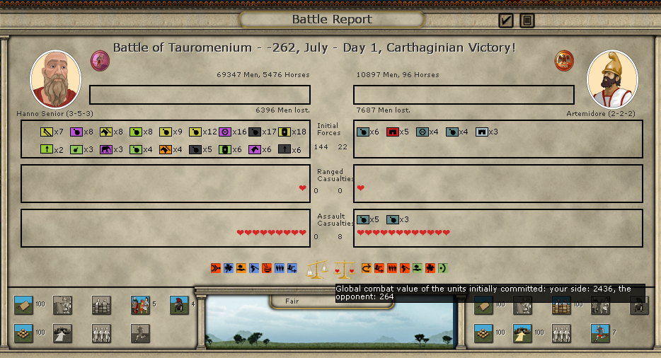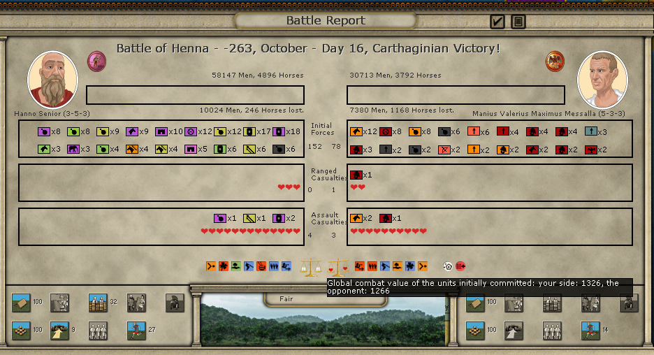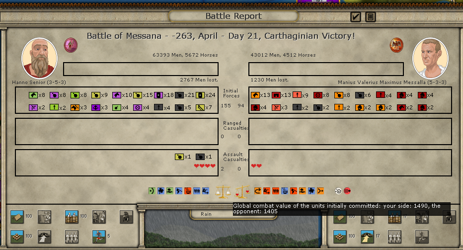Here are the battle results. It seems the Roman commander has a trait that allows him to deploy extra troops, which in a limited frontage situation like in the mountains in Messana can be very helpful: