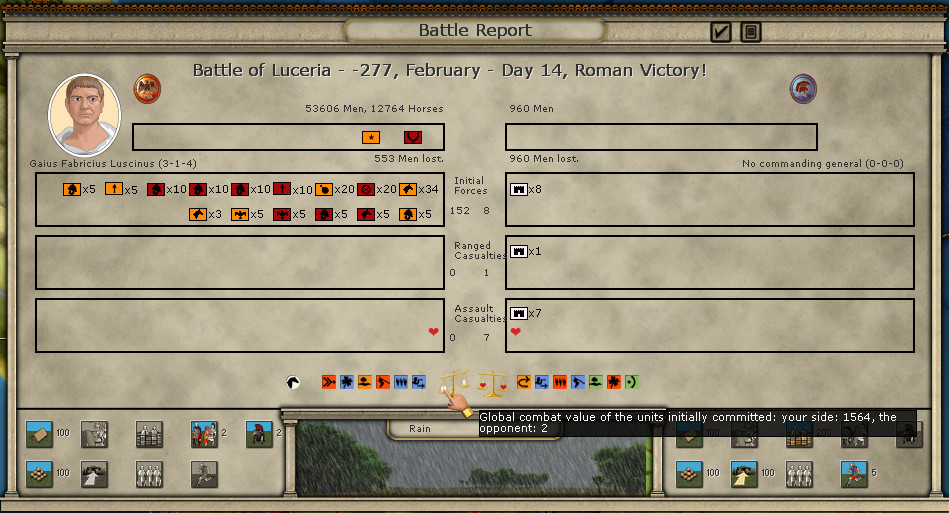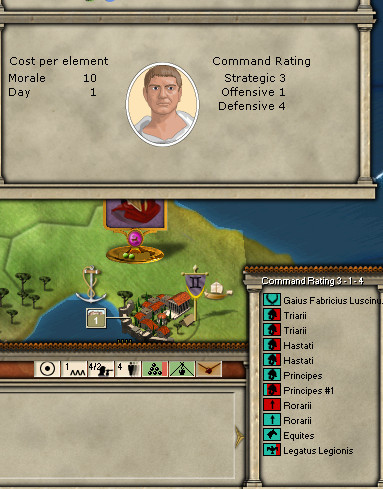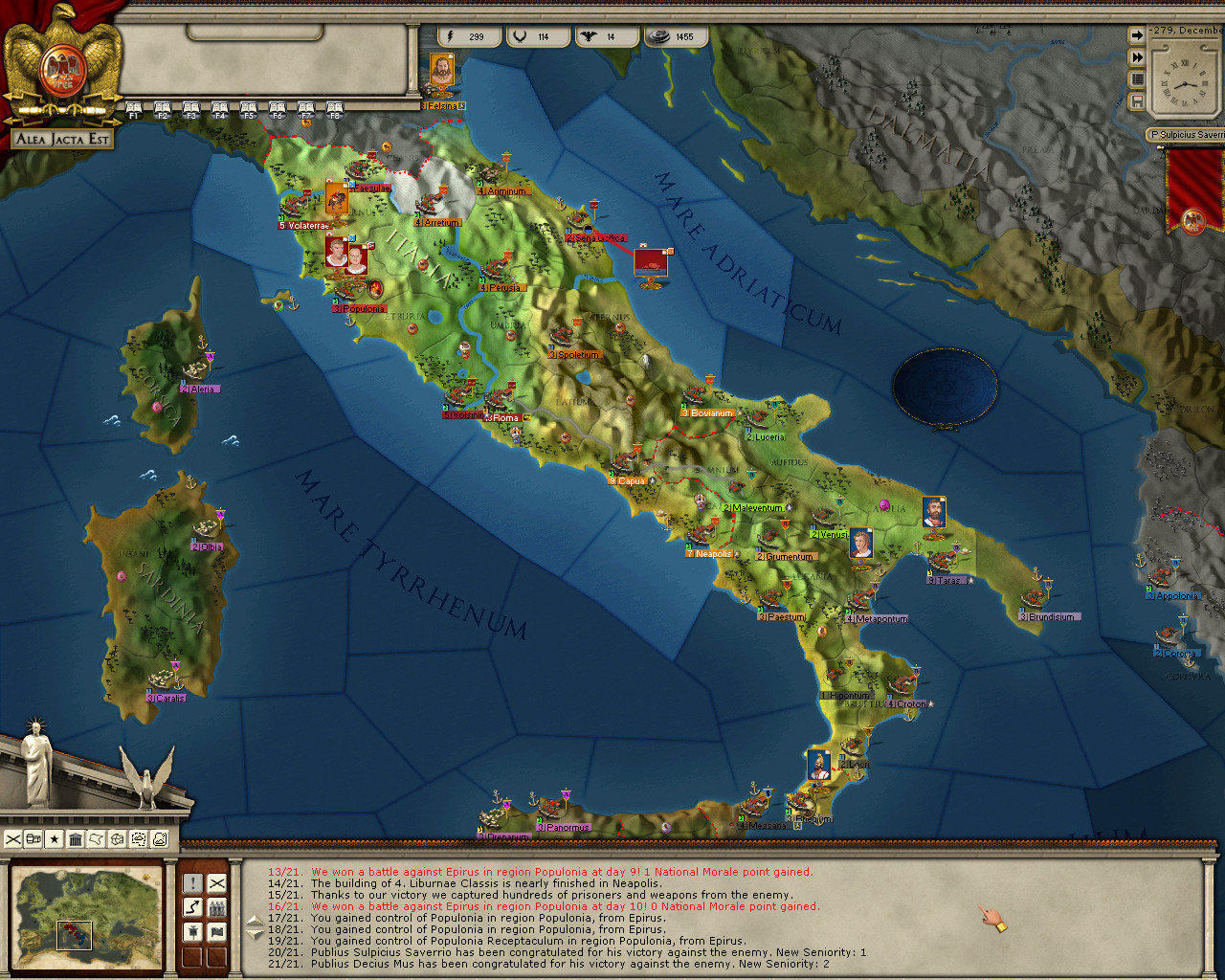 Sulpicius is not a bad general now - two XP stars from the battles has made him a 4-3-3 leader. Too bad he’ll be out in the next consular elections, by the time I face off against Pyrrhus in the south again.
