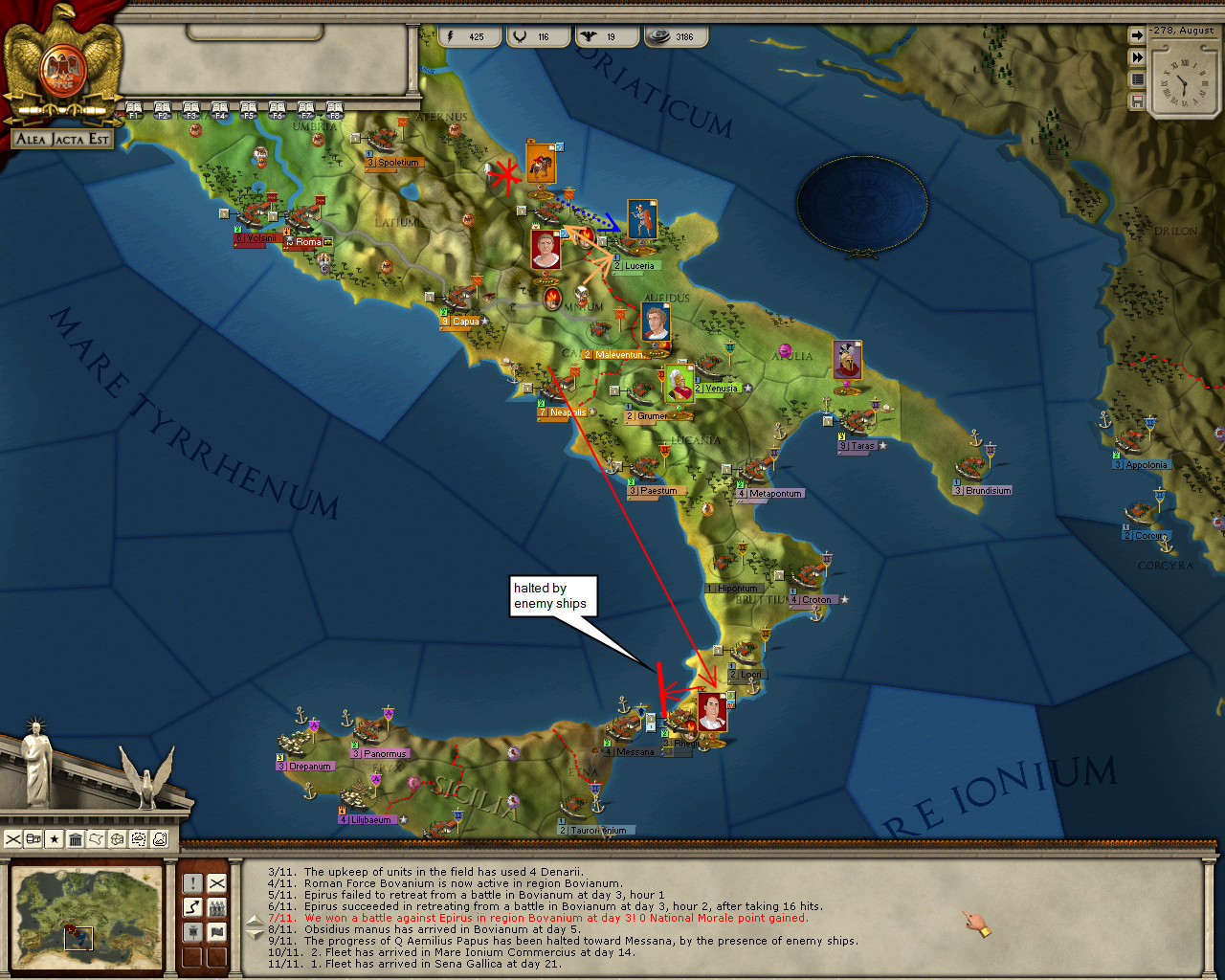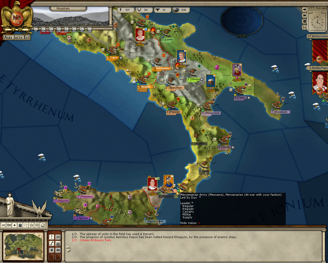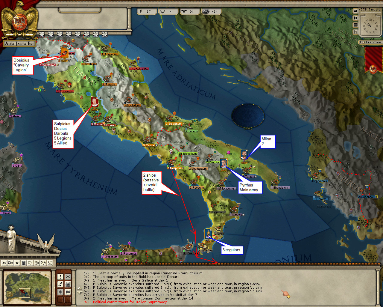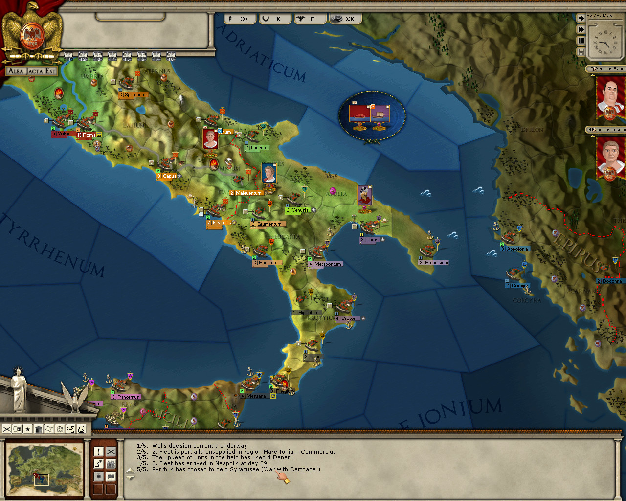 I wish I knew what was going on there. It’s seems Messana is under siege, probably by Pyrrhus allies in Syracuse (based on the province control info). And obviously, Epiran ships are blockading the city. Hmmm …