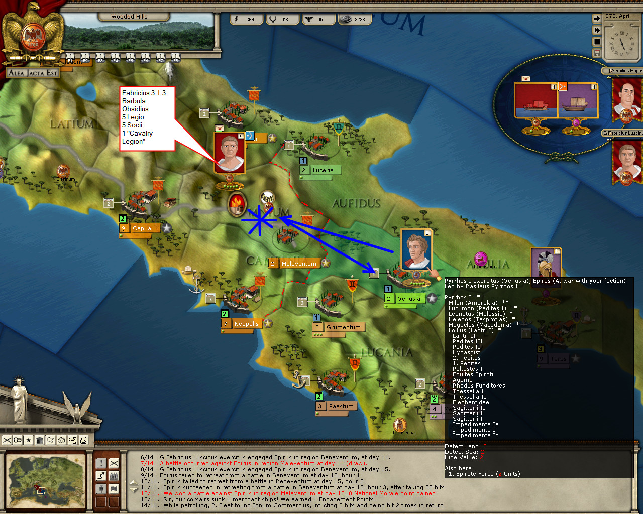 Fabricius is activated, and winter is ending, so, to finish off his consulship I’m contemplating plan to place my cavalry army in Pyrrhus’ rear area, where all those wagons are sitting out in the open …