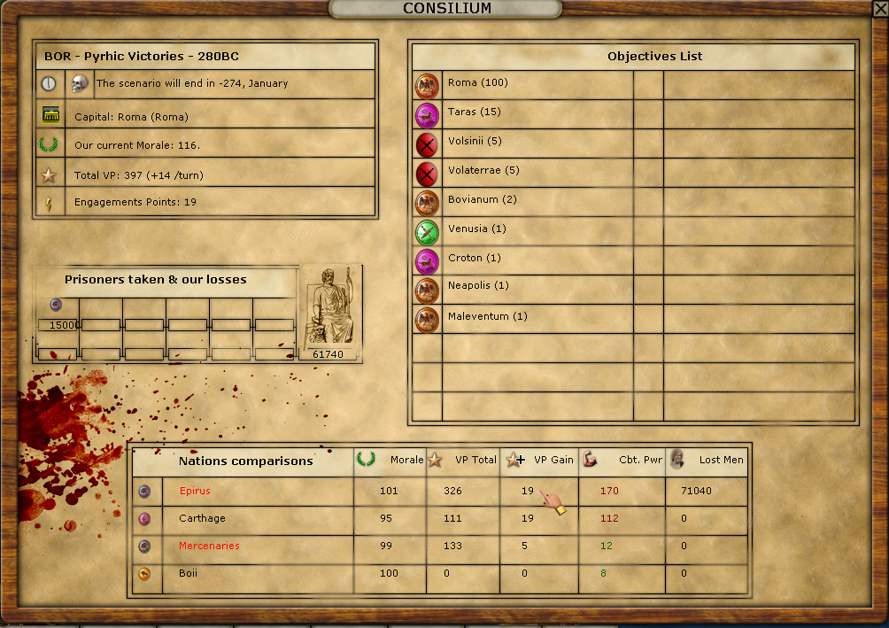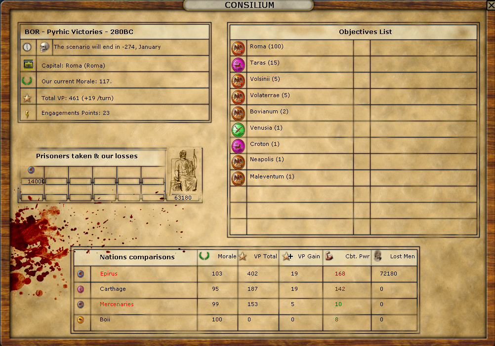 This is actually a tricky decision. I’m still way ahead in VP, but narrowing that gap by 20 is a lot (that’s the other cost of the option). Plus, I suspect what keeps Pyrrhus south of Rome is a strategy of Dictator denial. Do I want to remove that incentive of him not attacking me up north?