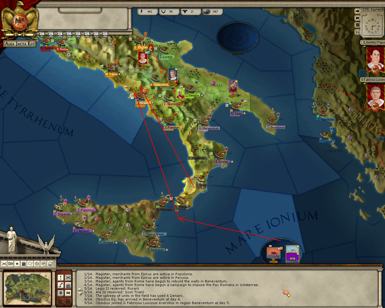 And what to do with my navy, who has brought me such welcome news? I think we shall come to the aid of our Carthaginian friends. Ahead full, ram speed ... if Pyrrhus tries to battle that Carthaginian fleet again off Catania, he'll get more than he bargained for!