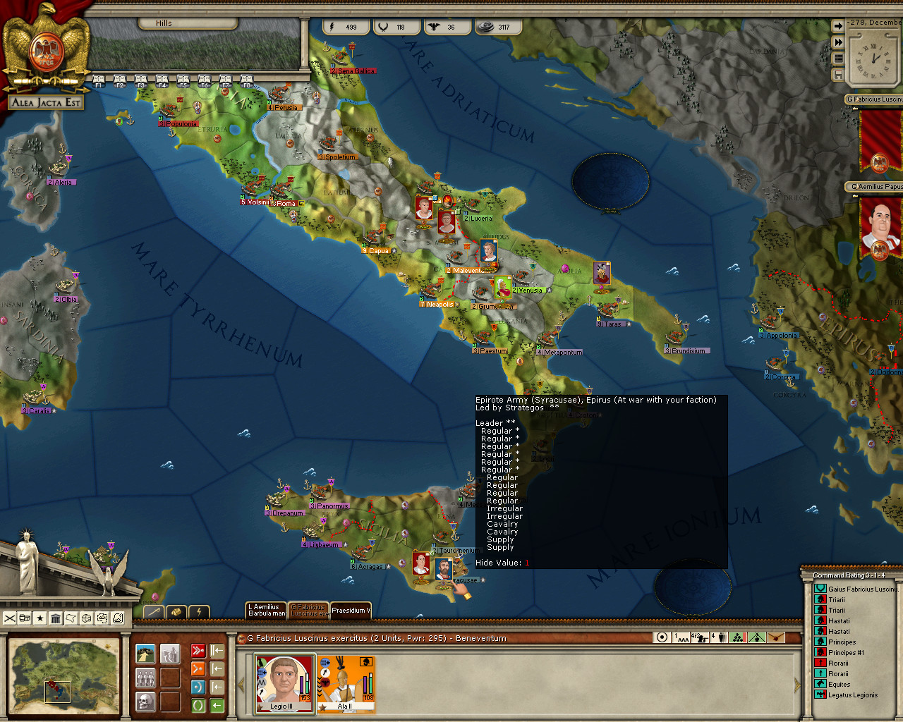 Aemillius moves to Messana, expecting that Milon may go there with his army, but he doesn’t. Not much to see here actually, so, I’ll probably send him back to the main army at Beneventum, where he can be useful in his remaining months as a legion commander. His career as a spy has been less than spectacular. Fabricius got a promotion after his defeat at Lucania, so I know he won’t take command by accident.