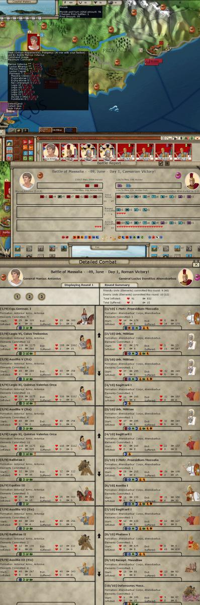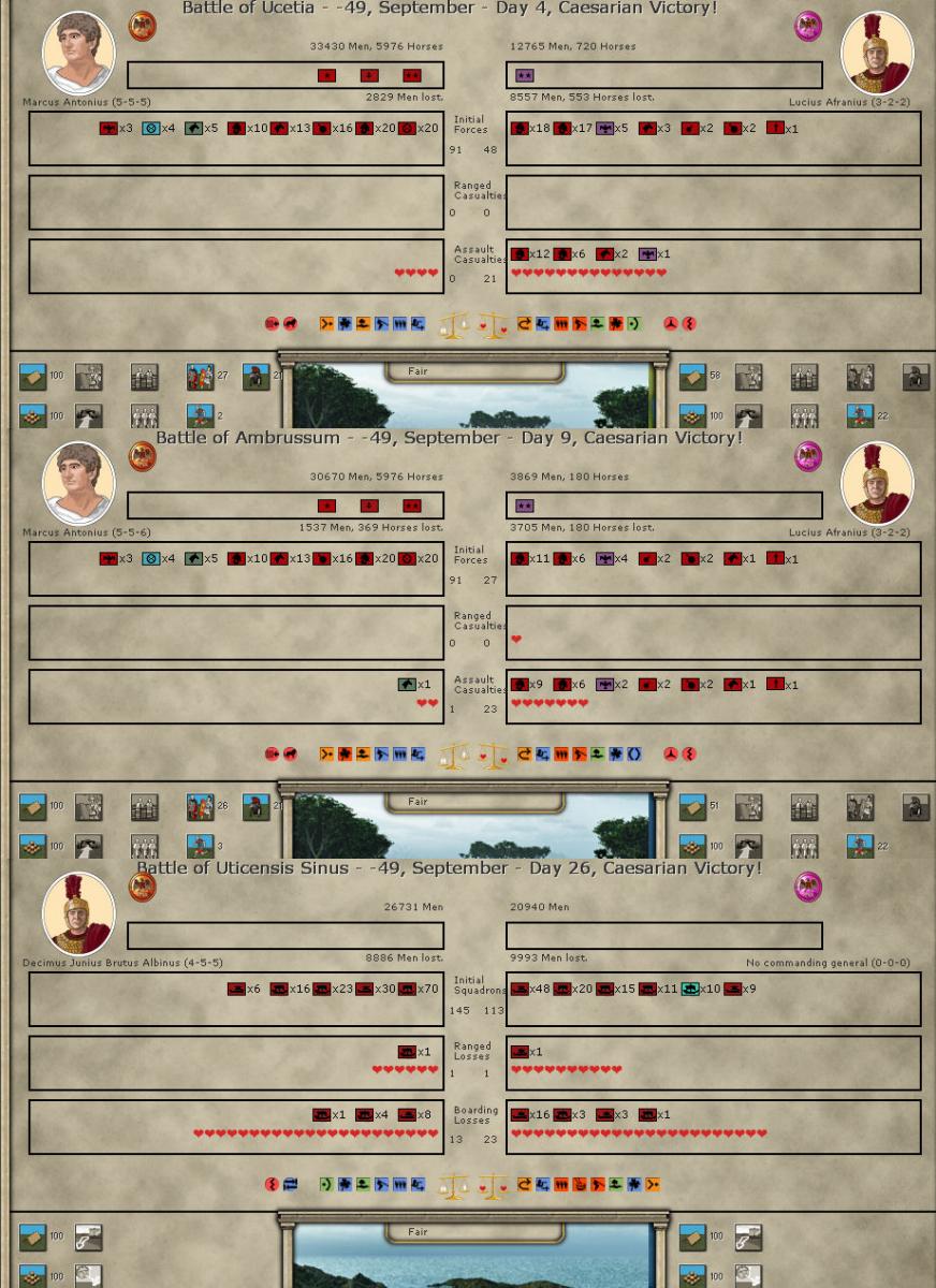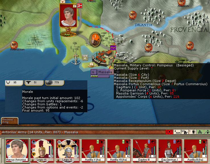 So as soon as the destruction of the Pompeian legions is complete, Hispania (I assume that’s where the legions came from) should be ripe for the picking. Antonius’ 3 legions and the 4 other legions in southern Gaul commanded by Curio and Fabius should make short work of it.