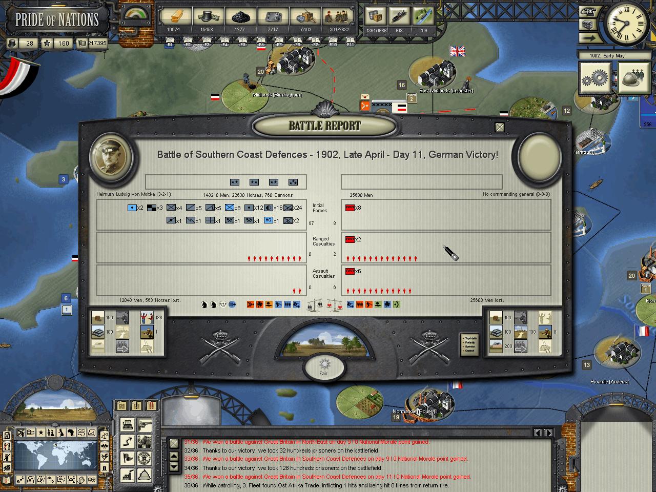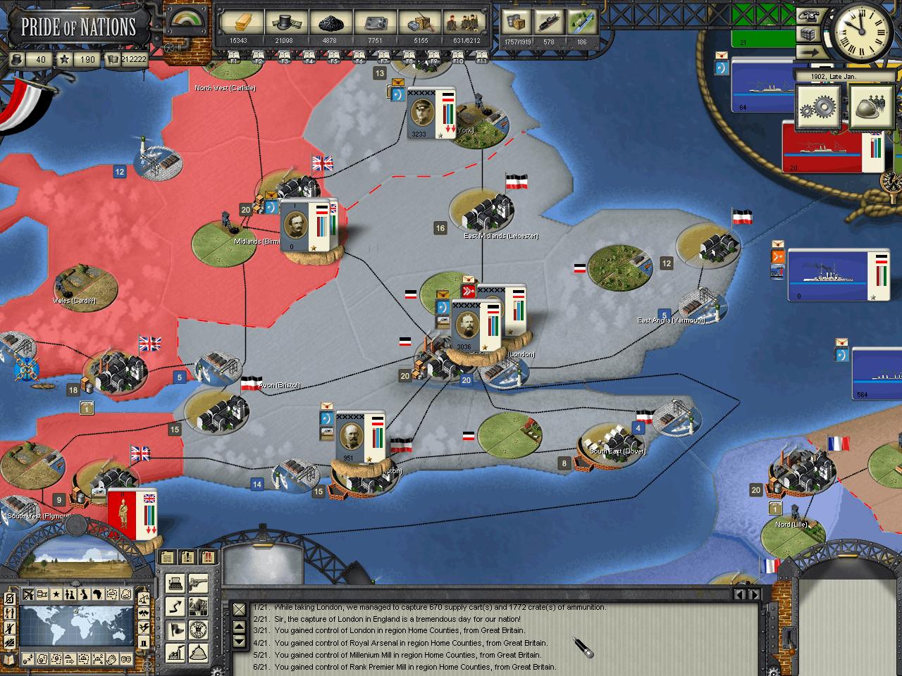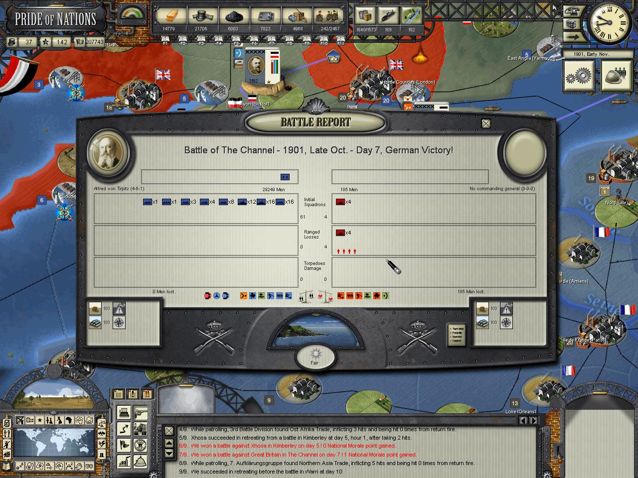 in my german game, looked for British fleet (which was once in great numbers in southern china fleet fighting pirates I guess - had to open britain to find it) - then lost track - except convoy duties british fleet never showed up anywhere (may have created a blockade around China - my silk no longer arrived in hamburg during war) - no Hiome fleet and I landed unopposed in British isles (nothing serious, just had to take Nigeria cities which remained British in spite of me getting a protectorate there and 100% control - blocks building anything -and took New guinea where, by event, british beat me to the clock - were already very much german colonized)