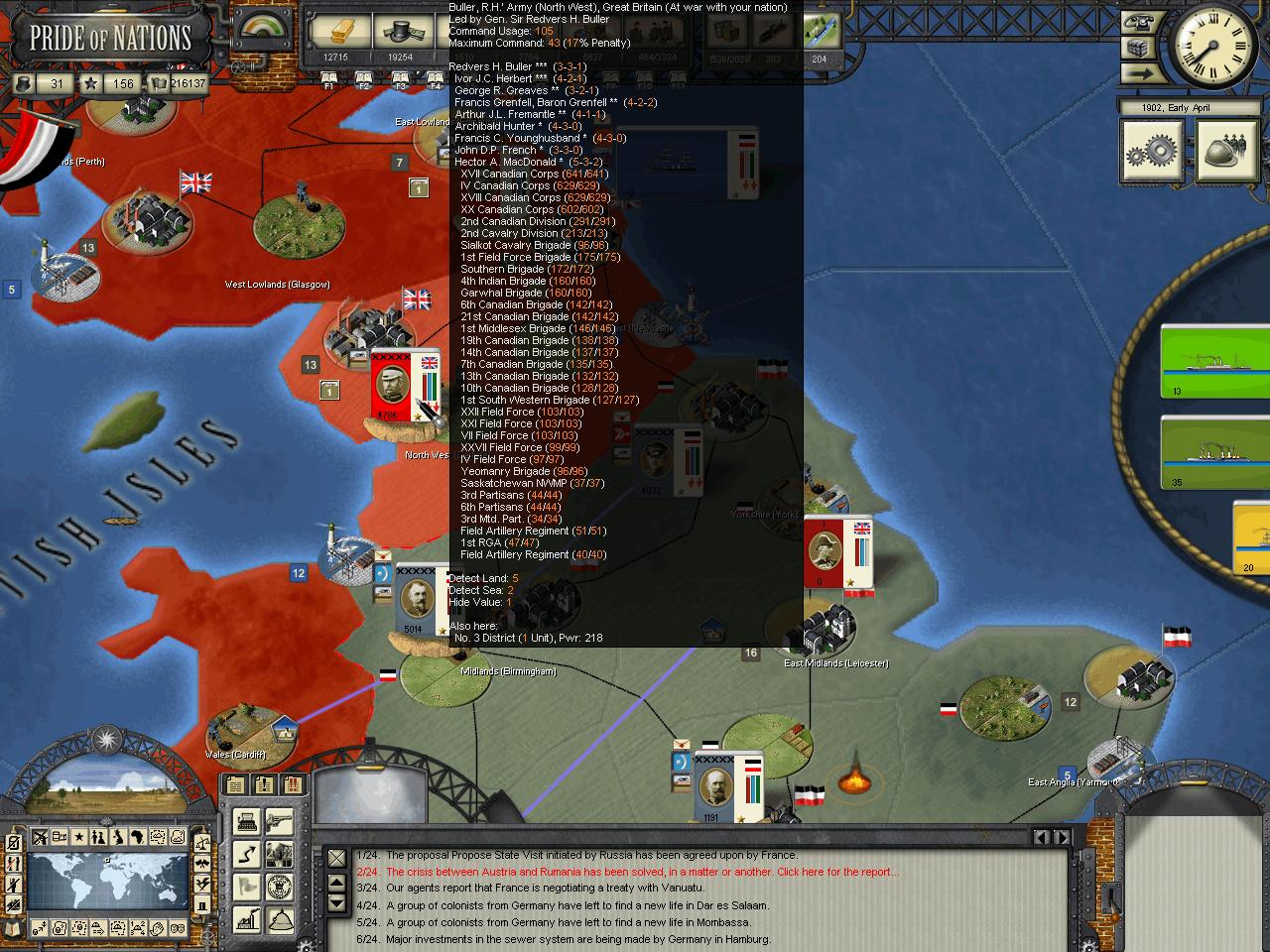 , although we have a commercial agreement and Denmark is cordial toward us (also with commercial agreeement, probably out of necessity as I could easily crush them, but I'm also the most apt to defend them. With France we always had very bad relations (and some crisis in the past years), so they're sure to come against me. In the far east Japan probably see me as a competitor with control of many pacific islands, but at the same time I could serve to weaken russia, so it's up to you to decide their stance, China is neutral towards me. The Russian Empire I think I don't even need to mention, they hate me, and any other power close to them will probably hate me as well.