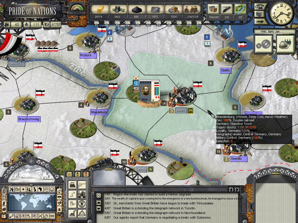 I agree with Kensai, that Britain is a pushover in the 1880 scenario, as it has not been able to build the massive PP lead that comes from an 1850 start. From the MP game, Germany and I think the US both have more industrial capacity (due to ruler stats I think). I have coal mines in Britain that I can't exploit. So my industry is limited, I can't even get any steam engines on my farms, so they are stuck at level 1. It's a balancing act.