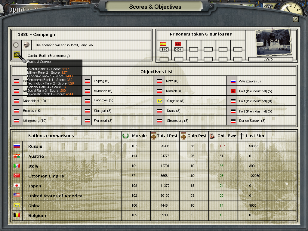And given the Prestige, I am pleased you have NOT won already, cause the increase in goals achieved in the 1880 scenario is really fast for Germany. I guess this happens because without the correct VP gains from SOIs Britain falls behind pretty fast. I wonder how my own campaign will go given that I started with the bug (no SOIs).