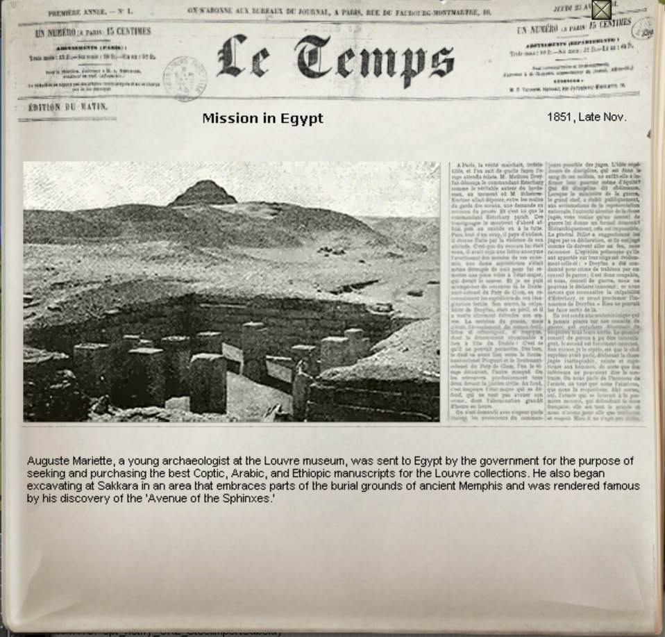 Paris - The Louvre has seen an explosion of visitors in the recent months to see the collections of artifacts brought from Ancient Egyptian sites. This sharp rise in tourism was brought on by the news of the discovery of the long-lost Avenue of the Sphinxes in Saqqara by French Egyptologist Auguste Mariette. This, no doubt, will put Mssr. Mariette's name in an immortal place in archaeological societies around the world, and the French government intends to make this momentous event into an opportunity for dignitaries around the world to celebrate together in our common history.