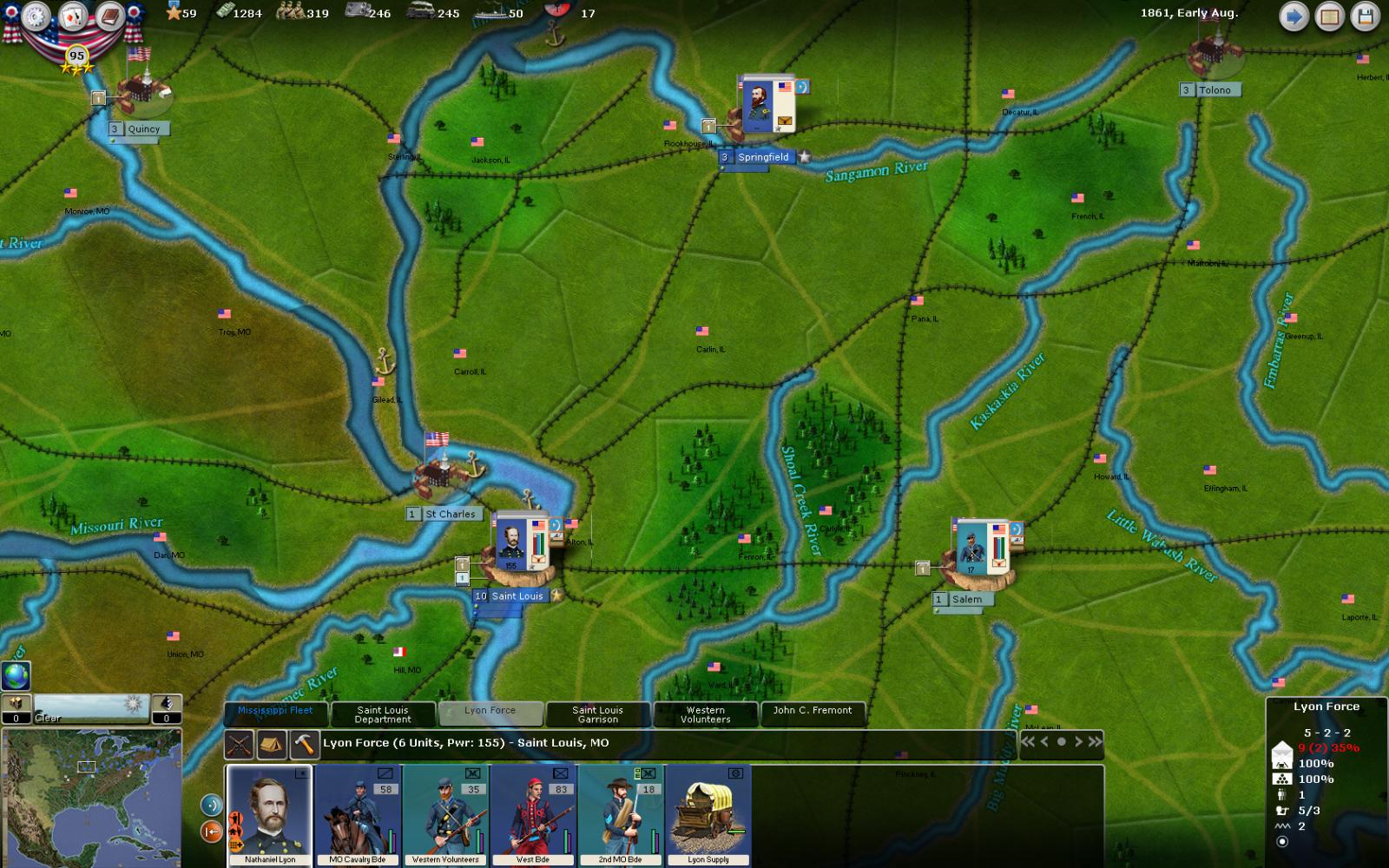 Once you have your army all set up, with generals at the head of each large formation, you'll want to move in enemy territory to either defeat opposing armies or conquer objectives. Here, you'll have to take into account the fatigue of your men, moving in enemy territory or difficult terrains. The fog of war (not detecting the enemy) will be a problem, unless you have strong cavalry forces. Some special orders will be at your disposal, like force marching, setting up a new supply depot, moving your forces by railways (should you have enough rolling stock). Each of your force will be commanded by a general, probably, but if they are too large for the officer to handle, you'll suffer a command penalty, that will slow down your forces and make them fight poorly. Juggling between too many small forces and a few large, under-commanded forces will also be part of the equation you'll face.