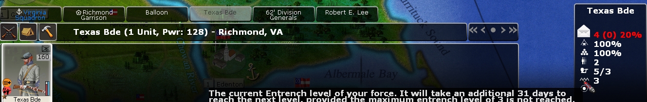 JohnnyReb wrote:- How do I entrench past level 3 or level 4? I never could figure this out. I would have a corps present in Fairfax and Manassas, but never saw the entrechment level rise past 3 or 4.