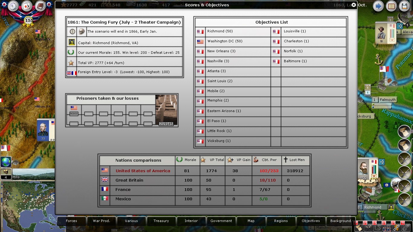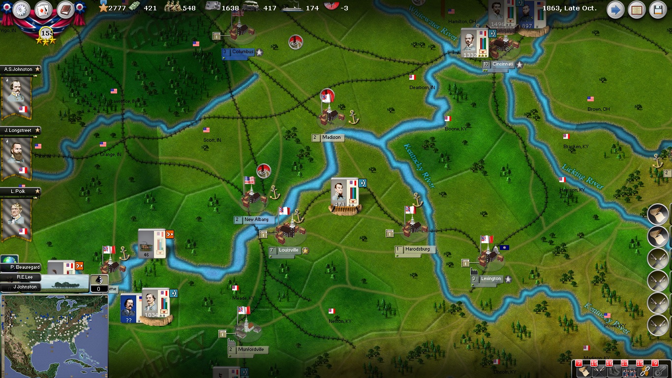 In regards to Chicago, in another game I have gone from St. Louis to Chicago, taking Springfield (IL) on the way. From Chicago, I met up in Indianapolis with my Kentucky force who had taken Columbus and Cincinnati prior. However, NM-wise it didn't make a difference [EDIT: or did you mean that thanks to the already existing NM difference, I should be able to hold Chicago and fight off everything they can field West of there?]. I got a steady boost of VP's, but that's all. Hence, I have started to doubt if I should ever extend my lines to that extent. Does the Union lose any NM for the strategic towns that are not objective cities?