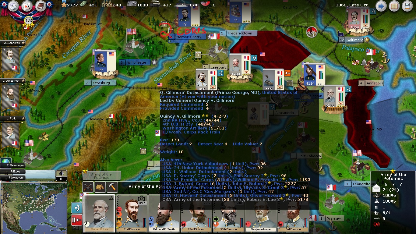 A 1100 pwr stack just finished in Alabama. Going to take out Ft. Pickens and then keep the army as a quick reaction force vs landings. My suicide cav and slight loyalty (yes, I spend all the demonstartion cards) tell me that Boston has a up to 1500 pwr stack. I have a 1200 pwr stack in New Orleans. NO has a fort, and the coastal regions have stockades with light artillery. I have shipped Alexandria Fort and Coastal Btr. to Richmond, and Annapolis, Baltimore and Philadelphia captured guns to (fort) Norfolk. I actually hold Ft. Morgan. I have 1 bde in Texas. Van Dorn took Denver (I used nearly all my partisans and copperheads aroud that region in the first two years + some rangers), which made Union move North from Santa Fe, after which I took Santa Fe. I razed Tuscon along with all the forts I could cause I invested very little in NM. I have a fort in New Madrid, with Cairo's captured guns.