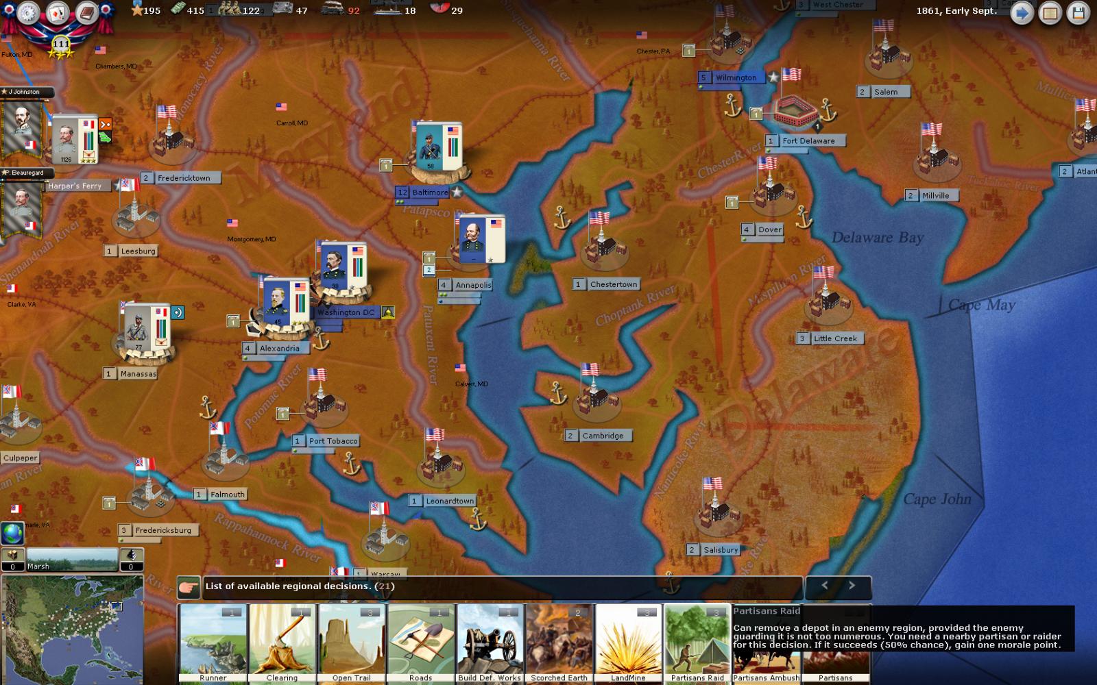To give some examples, we decided to only allow the levying of partisans through regional decisions, so that only a few can be on the map, and only in certain areas. But that's just the beginning, because now partisans are needed to play several particular and quite powerful decisions, like blowing an enemy depot or harassing the enemy. We also get decisions representing the raid of Confederate submarine Hunley, laying sea mines, setting up a defensive network and many more.