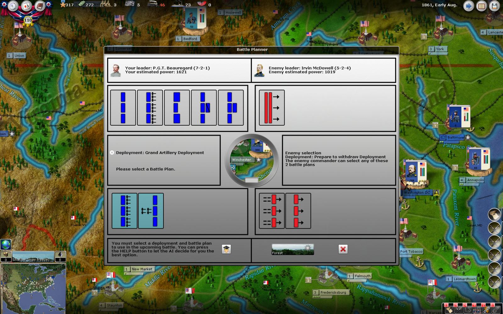 Once these steps are done, the battle unrolls as usual. A note though: the planner don't trigger for each battle, as this would become rapidly a chore, but only if you have a two or three stars general and if both sides have some significant troops. As you may know, battles in Civil War II are played in rounds, and each round the battle engine will check if your plan succeed or is countered by the enemy plan. Plans can have a tremendous effects on battles, for example a successful cavalry charge can cripple an enemy plan based on artillery duel, and in this case the artillery can be attacked by your units, even if normally artilleries can't as long as you have infantry holding the line. There is a great variety of effects, ranging from a modifier to a rating, to a special morale check to being able to attack support units...