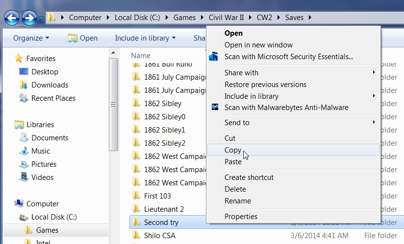 Then I used windows explorer to copy the appropriate save folder into a new directory. I then changed the folder name and each of the three files to a new name (keeping the CSA/Union portion of these filenames intact). Then I dragged the folder back to the CW2/Saves directory.