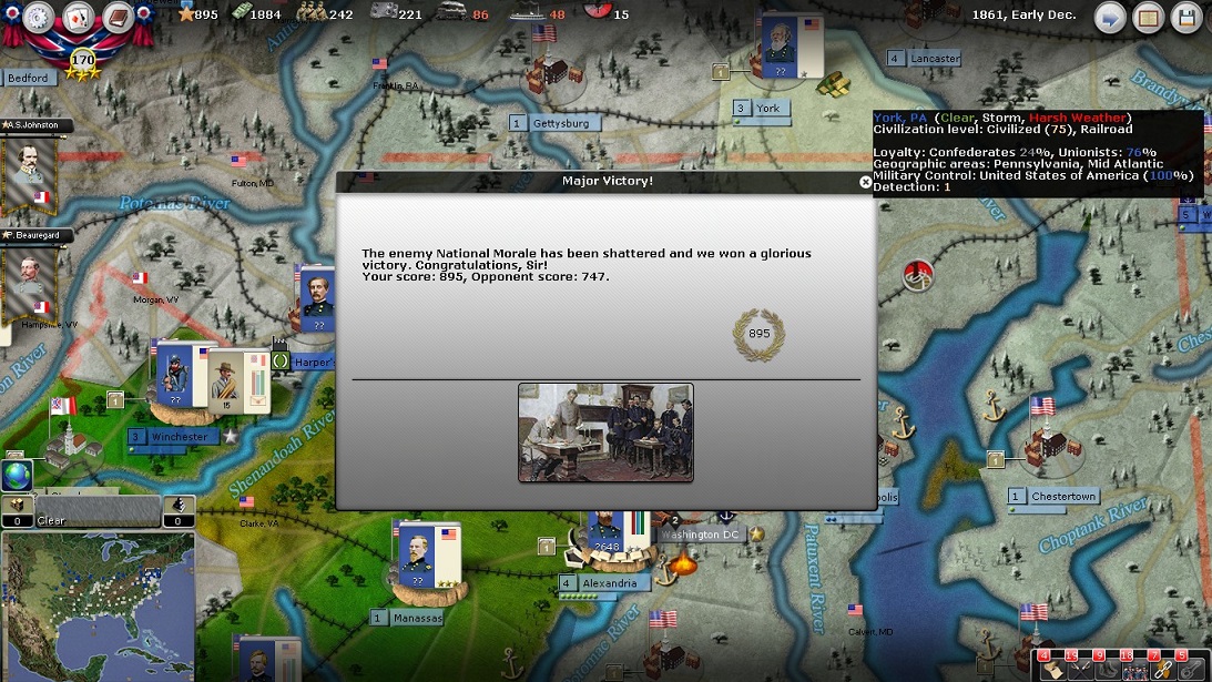 The CSA needs most of it troops to defend, and once the Union forces are on a roll, you can't defend all of the territory.