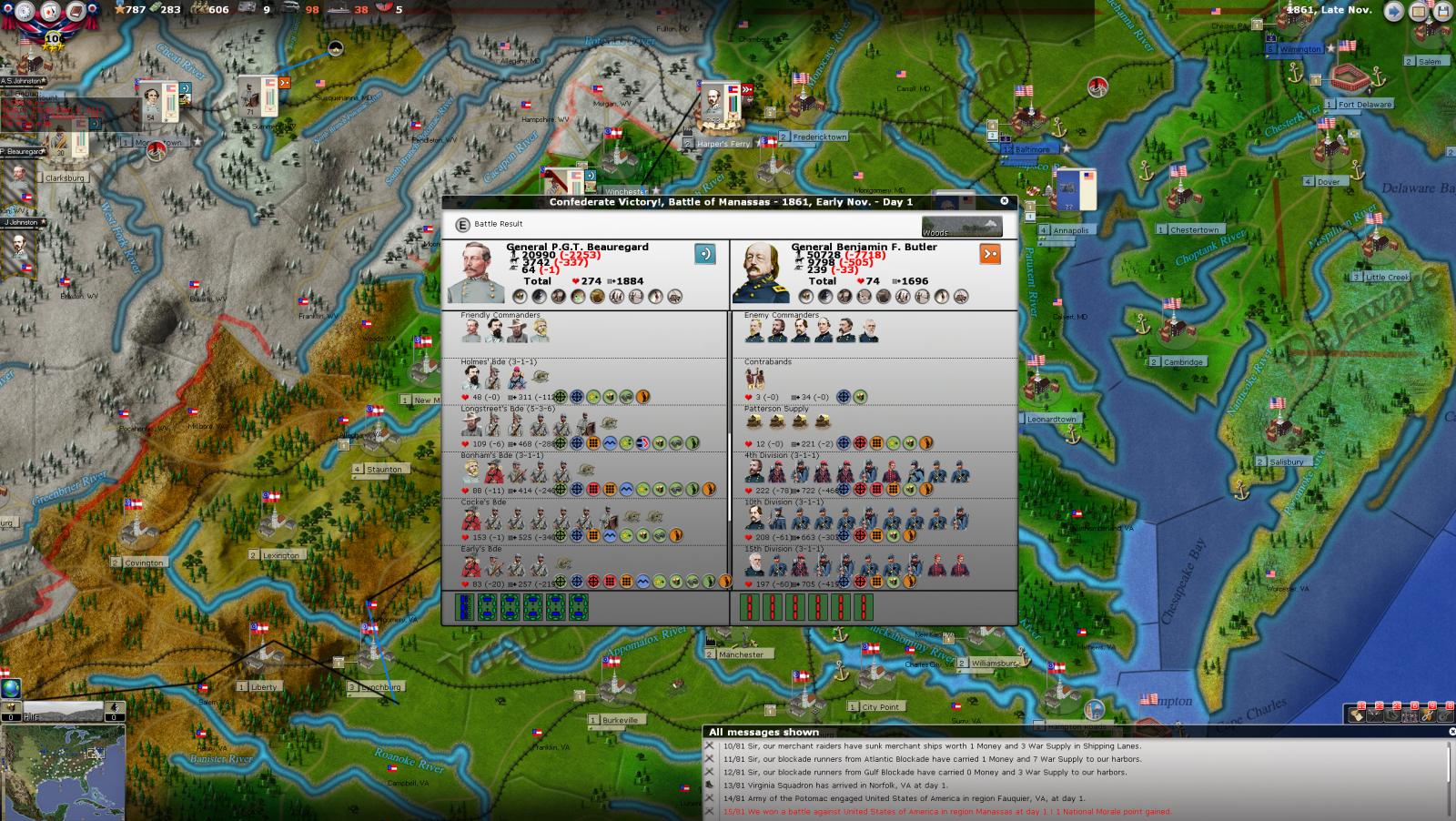 At some point during the second battle the battle engine decided that the overwhelming numerical advantage of Butler's army cause Beauregard to retreat.