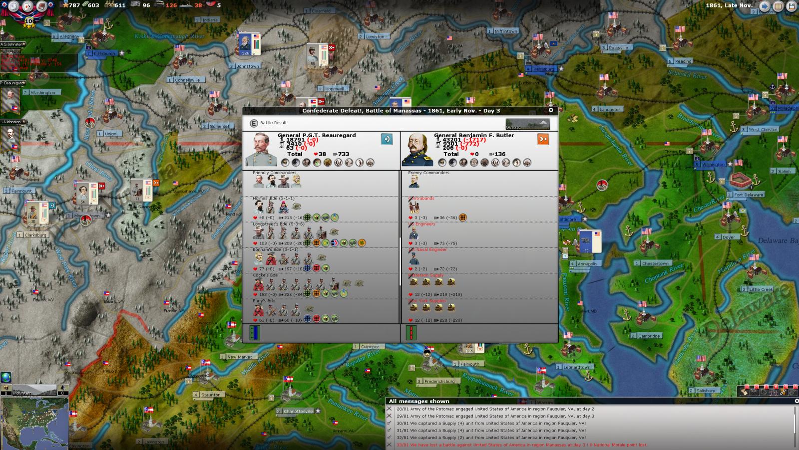 h: "Say perhaps Union will to retreat was perhaps 80% and CSA retreat will was 5%. Now figure the dices. That's possible". Have no problem with that rational, but I don't know or have not been provided with any substantive information one way or the other. I do know that the AoP defeated (survived in some cases) the Union in 6 prior battles, and yes some units may have reappeared/re-engaged, at least I think so, in some of those later battles during that cycle (not like the Union has a shortage of units to send into the fray... I'm just happy to have survived) and during the final major battle depicted in pic 1. But I don't know if they are truly retreating or not- "I'm sorry Sir but the 37 horse's with messengers bearing the message of the Union's retreat tossed embolisms, and we were not able to inform you that what was left of 60,000 troops were heading back North". But in this last instance, I cleaned the Union's clock albeit however unfair, it was still a victory (see footnote regarding Iraqi Road of Death).